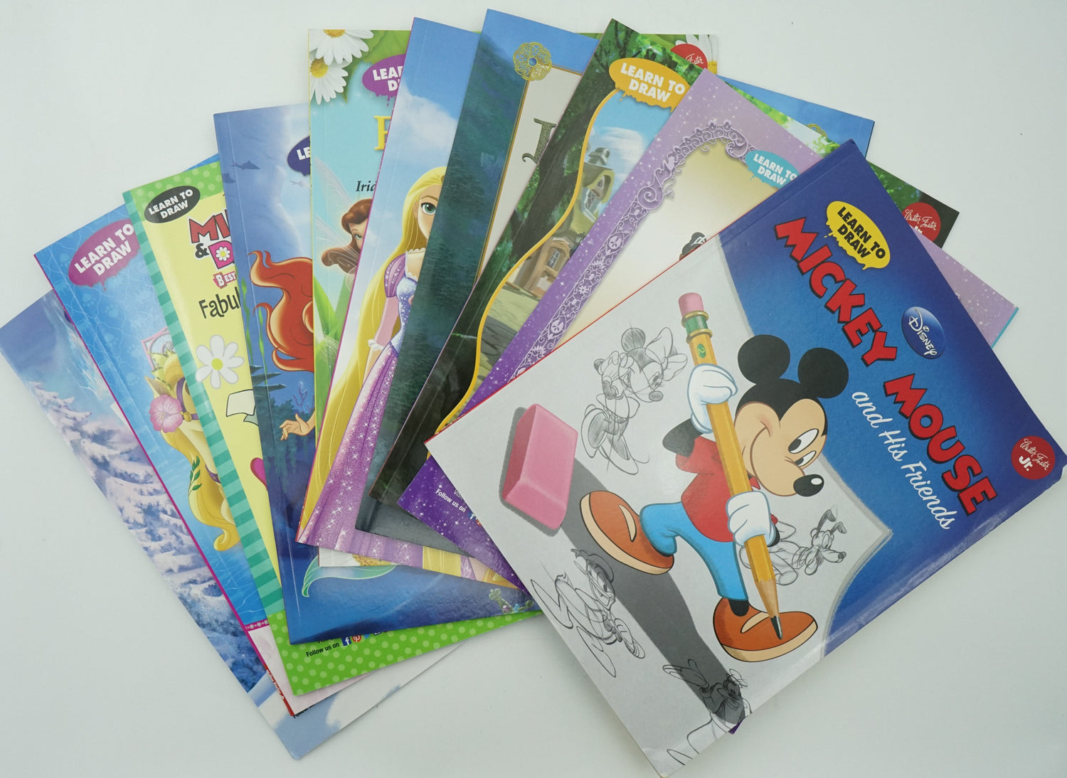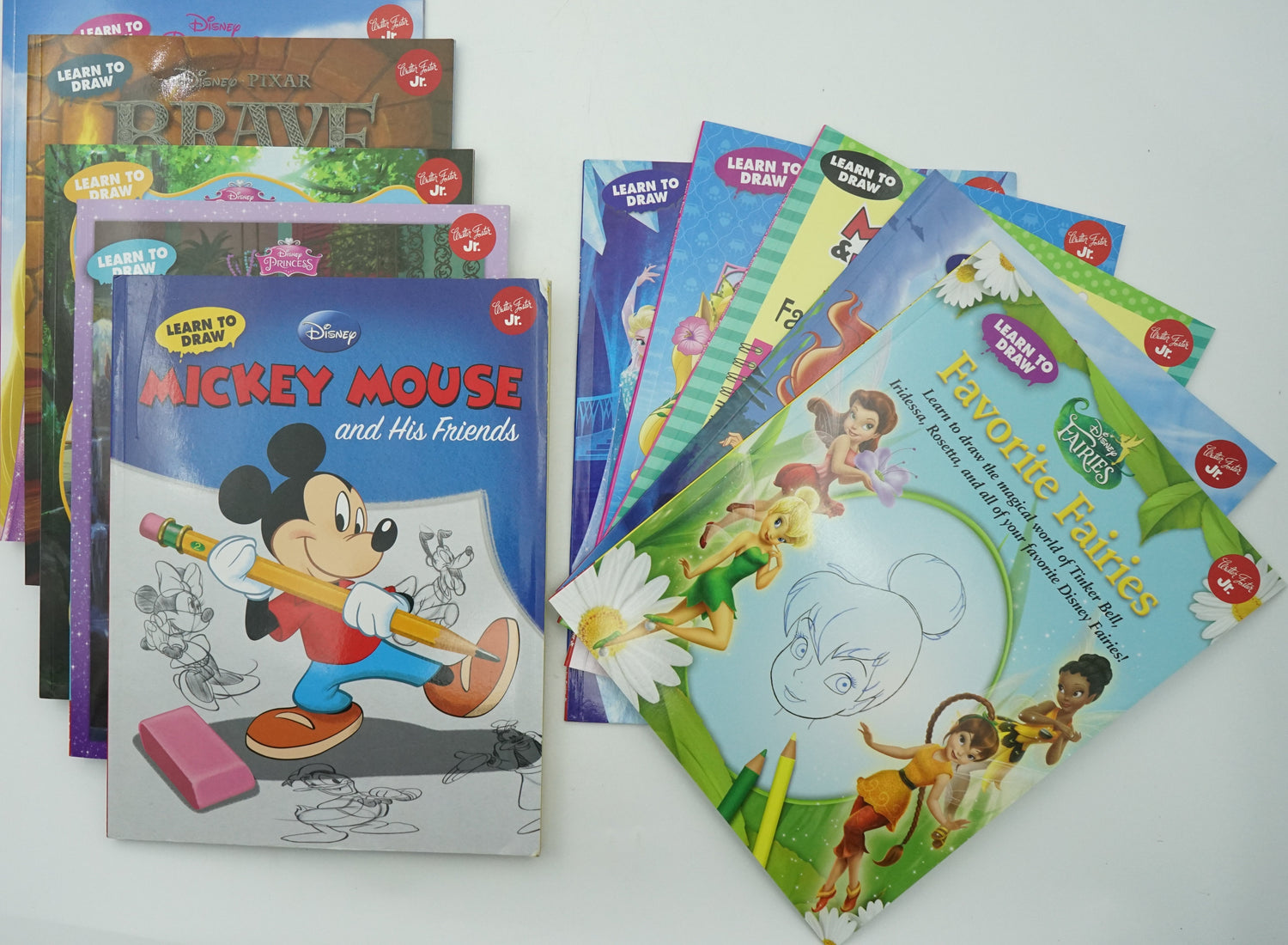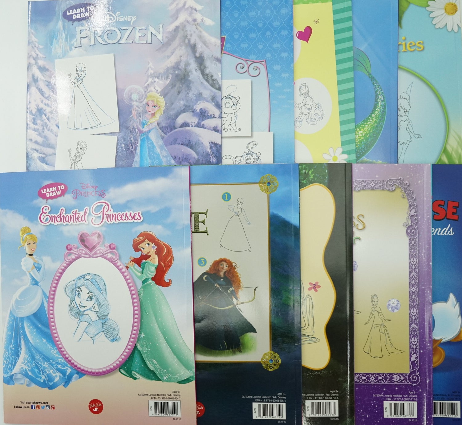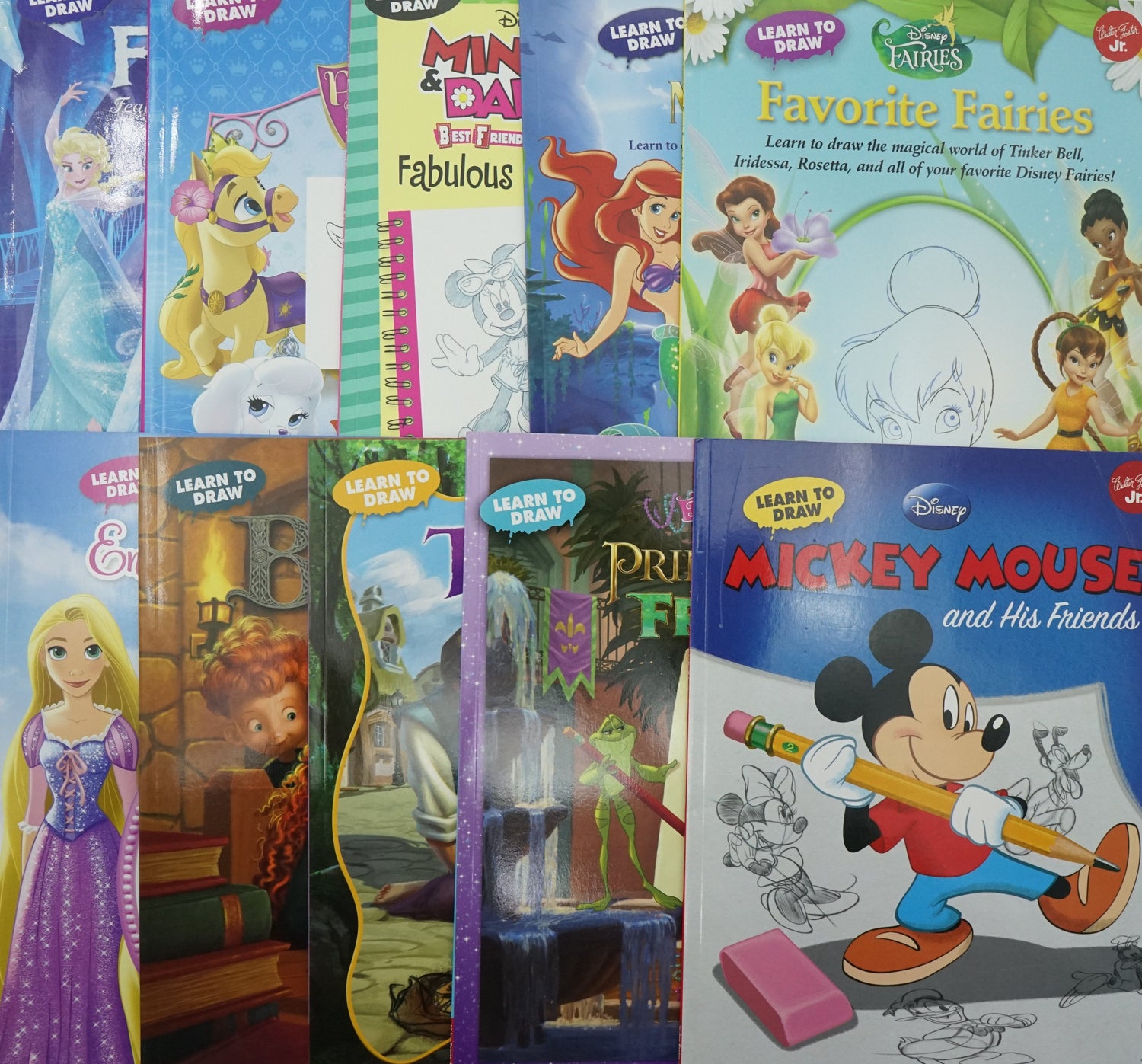 Disney Learn To Draw Books (Now with Frozen) Disney's drawing books nurture children's creativity by teaching them to draw their iconic characters. From classics like Cinderella and Mickey Mouse to modern favorites Elsa and Tiana, kids learn how to draw the characters in just six steps each. Softcover books 32 pages per book Beloved Disney characters Teaches 6 steps for drawing each character Recommended for ages 6 to 12 Product dimensions: 11"x8.5" Bundle Contents: Brave, Enchanted, Princesses,Favorite, Fairies, Frozen, Mickey Mouse and His Friends, Minnie and Daisy, Palace Pets, Tangled, The Little Mermaid, The Princess and the Frog.