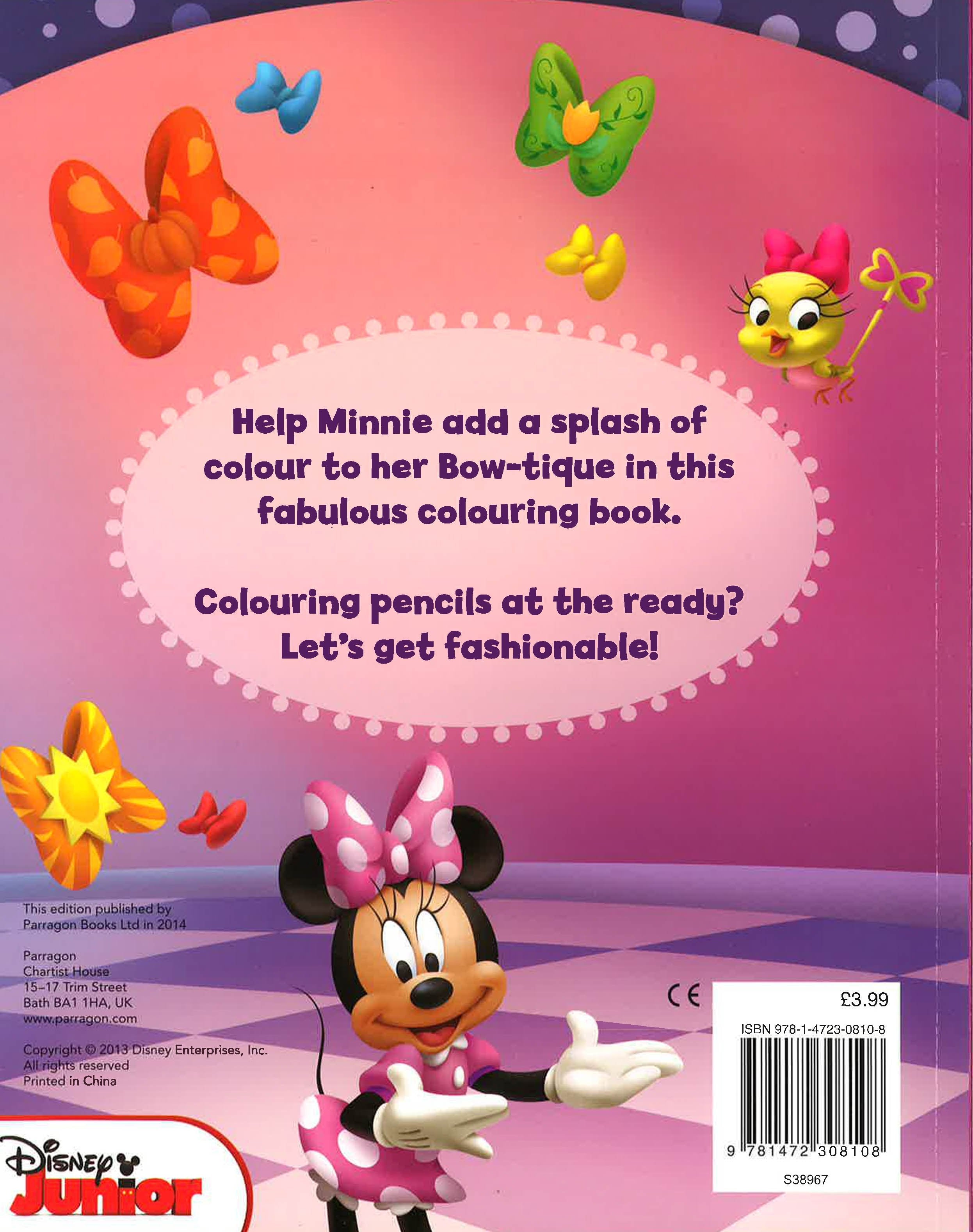 Help Minnie add a splash of colour to her Bow-tique in this fabulous colouring book. Colouring pencils at the ready? Let's get fashionable?