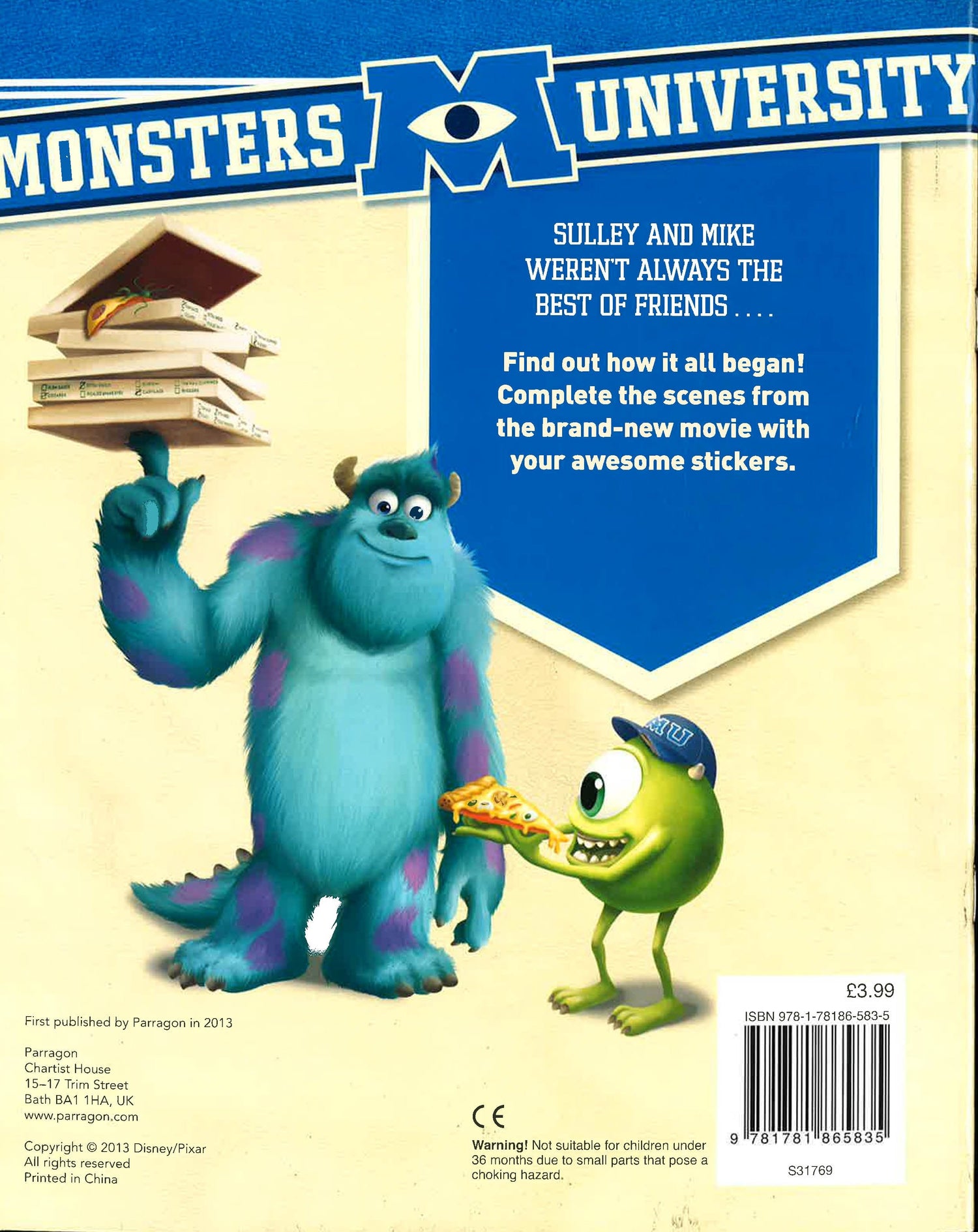This book features amazing colourful scenes from the Disney Pixar film Monsters University. There are over 50 stickers your child can use to complete the scenes as they read the story.
