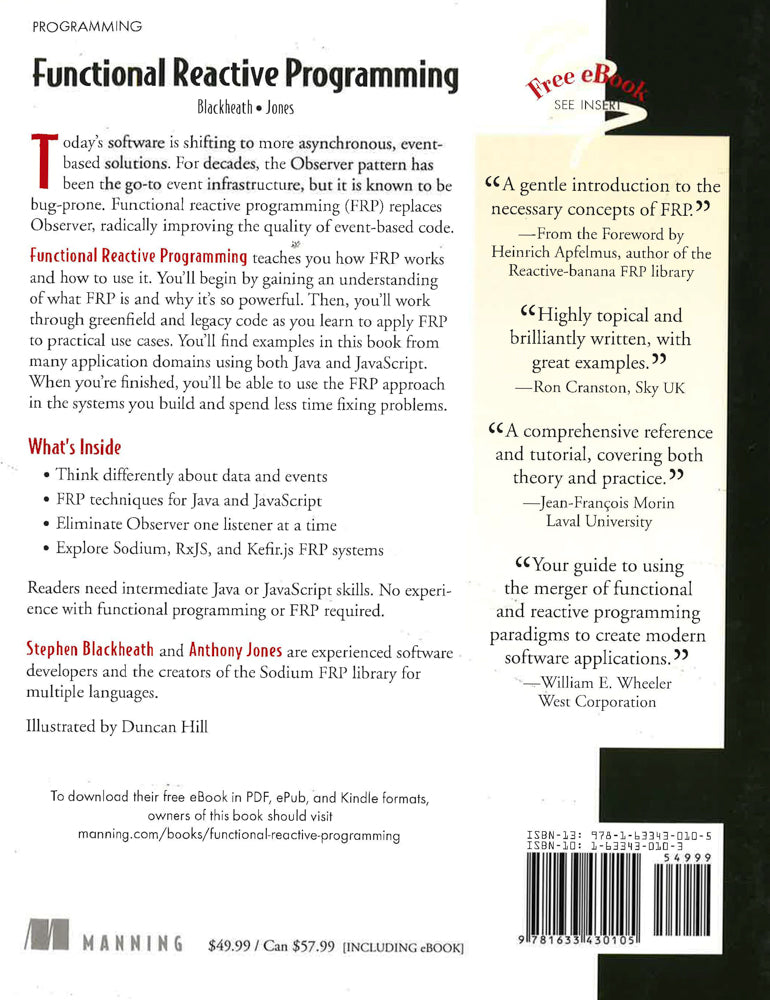 DESCRIPTION Most software applications must handle user or system-generated events. The most widely-accepted event handling model is the Observer pattern, in which an object "listens" for changes in the application's state and then reacts by executing a unit of code-the problems is that this approach is prone to bugs. Functional Reactive Programming (FRP) is an alternative to the Observer pattern. It's designed to deal with events as a stream of values over time rather than as a series of unique responses to discrete changes in state, keeping logic tidy and eliminating the bugs that plague event handling code with no loss of expressiveness. FRP is useful anywhere the Observer pattern is common, including user interfaces, video games, networking, and industrial applications. Functional Reactive Programming teaches the concepts and applications of FRP. It begins with a careful walk-through of the FRP core operations and introduces the concepts and techniques needed to use FRP in any language. Following easy-to-understand examples, readers will learn how to use FRP in greenfield applications and how to refactor existing applications. Along the way, the book introduces the basics of functional programming in a just-in-time style, so readers never learn anything before they need to use it. By the end of the book, readers will be able to use FRP to spend more time adding features and less time fixing problems. KEY SELLING POINTS Step by step guide to developing FRP applications Think differently about data and events Spend less time fixing problems and more time adding features AUDIENCE This book presents examples in Java, C++, and JavaScript using the Sodium, Flapjax, and BaconJS libraries. No prior experience with functional programming is required. ABOUT THE TECHNOLOGY Reactive programming is a broad concept, where programs are event-based and viewed as a data flow. Functional Reactive Programming is a specific type of reactive programming that improves the quality of interactive applications, allowing developers to spend more time adding features and less time fixing problems.