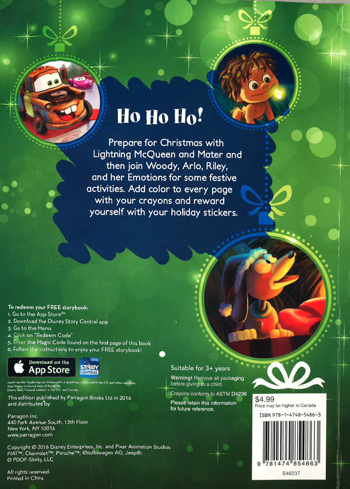 Ho Ho Ho! Prepare for Christmas with Lightning McQueen and Mater and then join Woody, Riley and her emotions for some festive coloring and activities in this Disney Pixar Christmas Crackers book. Add color to every page with the included 4 chunky crayons and reward yourself with over 30 holiday stickers. This book also comes with a bonus code for a free digital storybook!