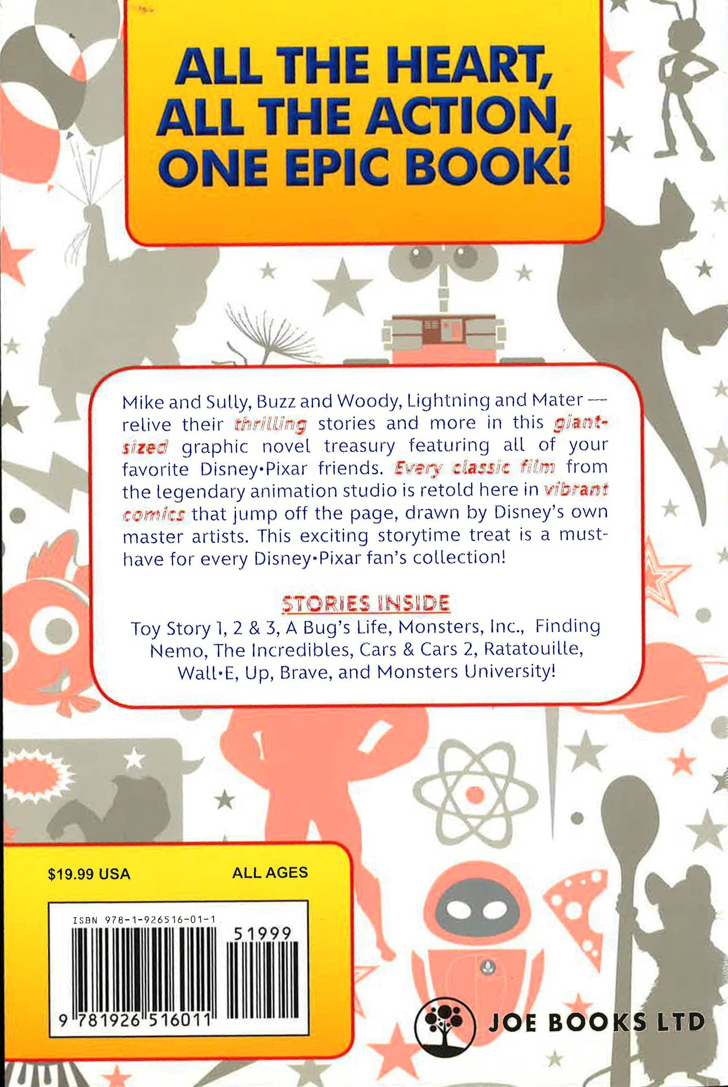 Mike and Sully, Buzz and Woody, Lightning and Mater - relive their thrilling stories and more in this giant sized graphic novel treasury featuring all of your favorite Disney?Pixar friends. Every classic film from the legendary animation studio is retold here in vibrant comics that jump off the page, drawn by Disney's own master artists. This exciting storytime treat is a must-have for every Disney?Pixar fan's collection!Stories InsideToy Story 1, 2 & 3A Bug's LifeMonsters, Inc.Finding NemoThe IncrediblesCars & Cars 2RatatouilleWall-EBraveMonster's University