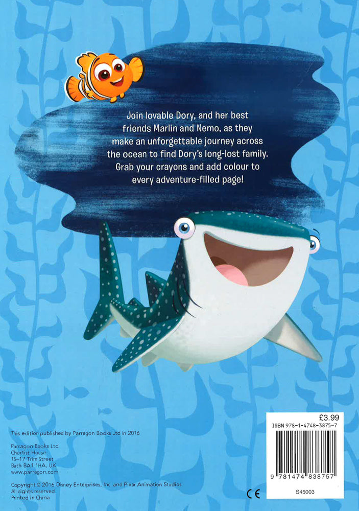 Join lovable Dory and her best friends Marlin and Nemo as they make an unforgettable journey across the ocean to find Dory's long-lost family, meeting new friends like Hank the septopus along the way. Grab your crayons and add colour to every adventure-filled page!