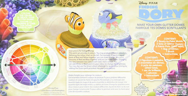 From disneys blockbuster hit movie finding dory comes this adorable innovative glitter dome craft kit. included in the box is everything your child needs to create two 2 beautiful glitter domes one each for nemo and for dory! each ready-to-paint mold can be painted using the included paints and brush. once complete the domes can be filled with the included glitter filled with water and assembled around each masterpiece! the clever double-walled design of the globes allows the glitter to float freely in the water but neither water nor glitter ever touches the painted sculpture! full instructions come with the kit there is even a colour mixing guide on the box allowing an extensive colour palette to be created using the 6 included paint pots! completed the dome stands 5.75 inches high by 6 inches wide by 3.5inches deep. hours of creative fun will result in two breathtakingly beautiful glitter domes! this is a perfect gift for finding dory fans of all ages and snow globe and glitter dome collectors! kit includes everything required to create 2 beautiful glitter domes simply add water 2 double-walled domes mean that water and glitter will never actually touch the painted masterpieces 2 ready-to-paint sculptures are included one dory and one nemo 6 colours of paint and a colour wheel on the side of the box will provide a full palette of colour glitter paint brush and full instructions are also included each assembled dome measures 5.75 inches high by 6 inches wide by 3.5 inches deep.