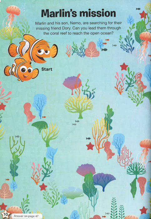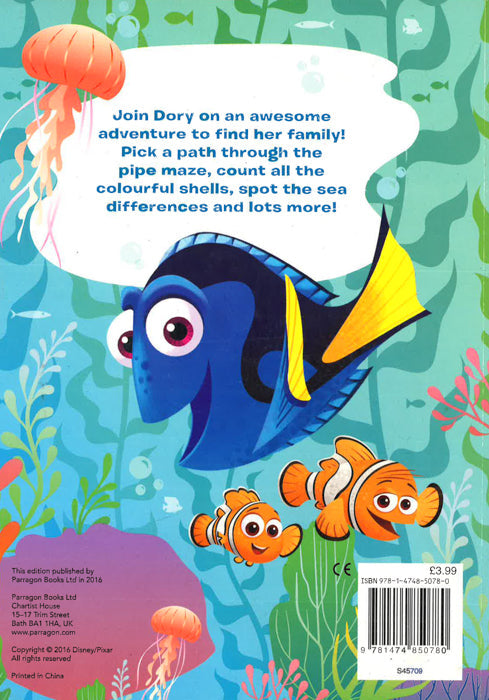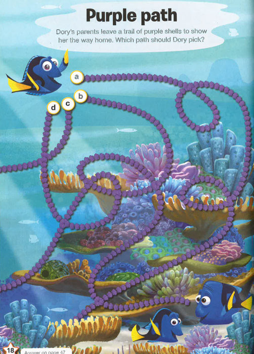 Join Dory on an awesome adventure to find her family! Pick a path through the pipe maze, count up all the colourful shells, spot the sea differences and lots more!