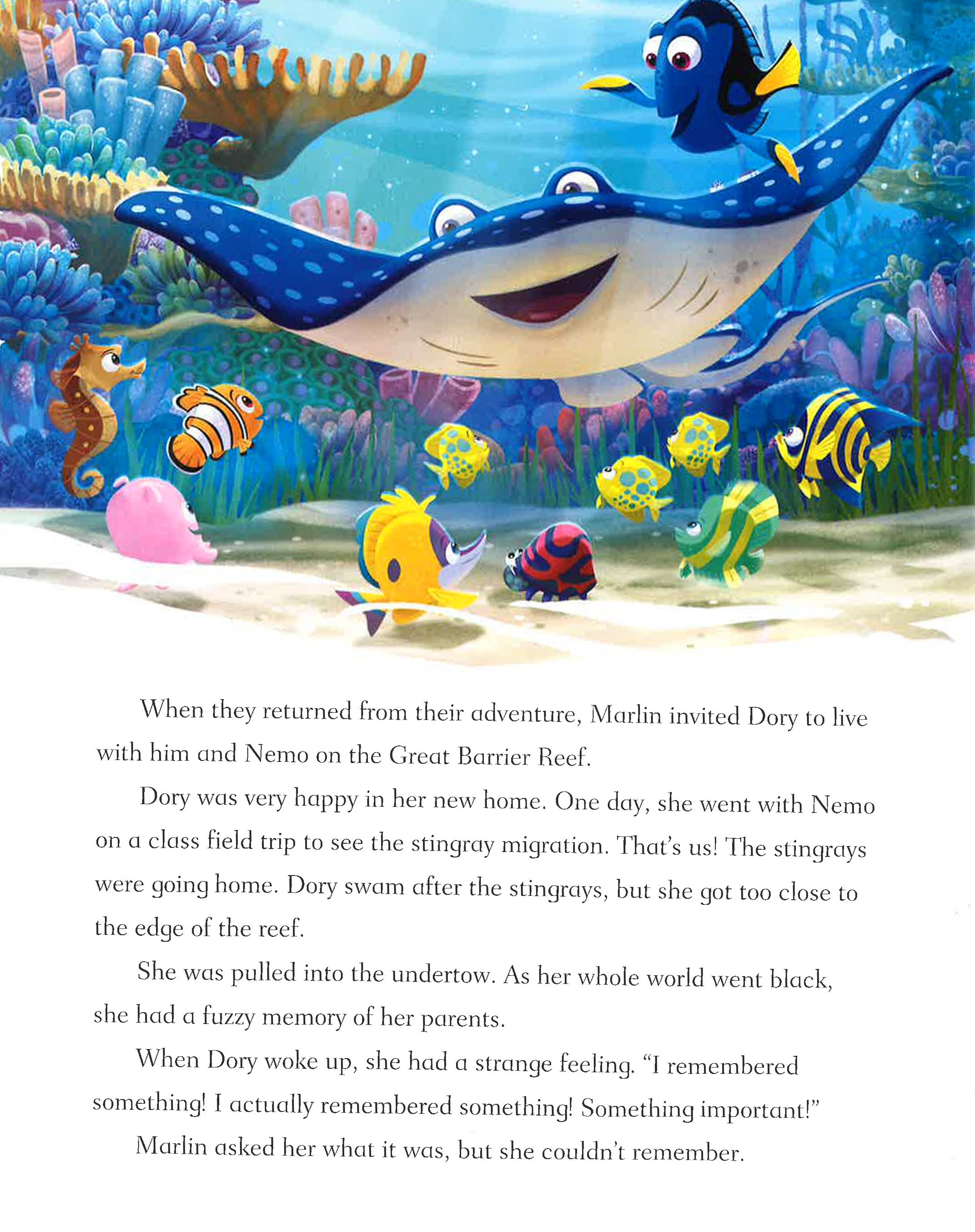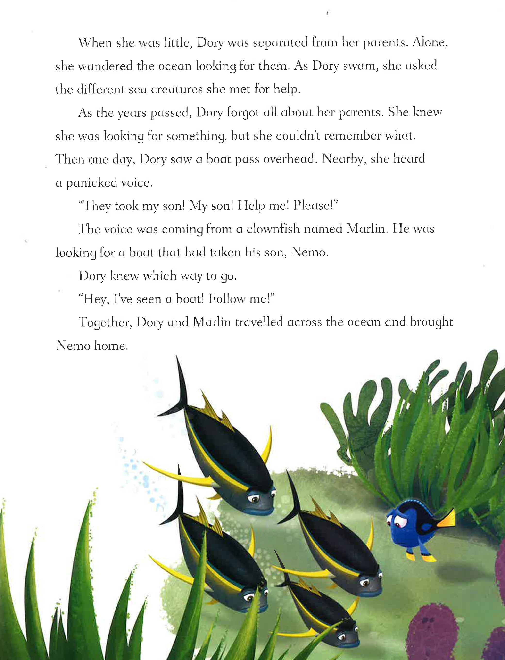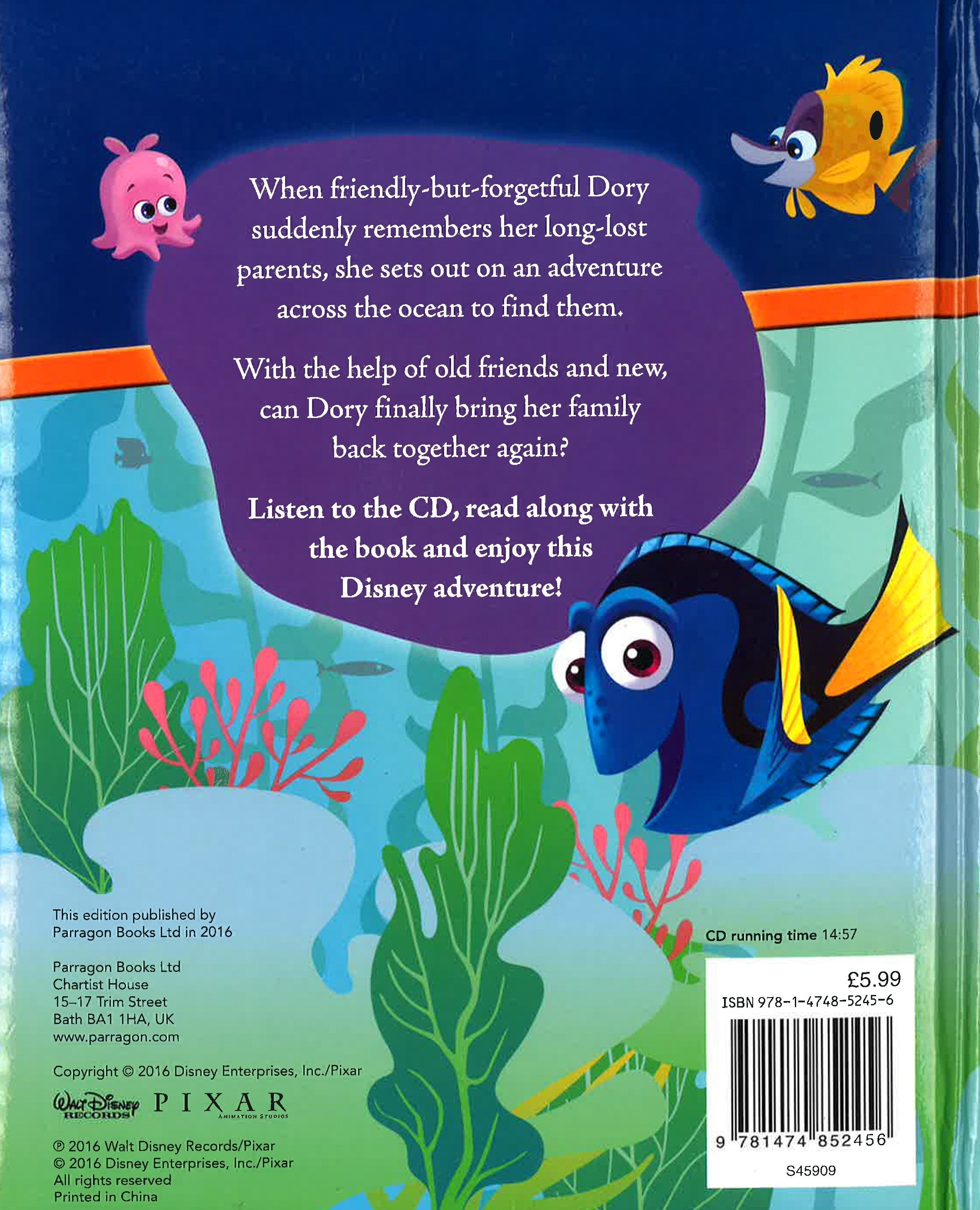 Read-along with the Disney Pixar movie Finding Dory with this book and CD. When friendly but forgetful Dory suddenly remembers her long-lost parents, she sets out on an adventure across the ocean to find them. With the help of old friends and new, can Dory finally bring her family back together? Read along as you listen to the CD of the book and enjoy this Disney Pixar adventure!