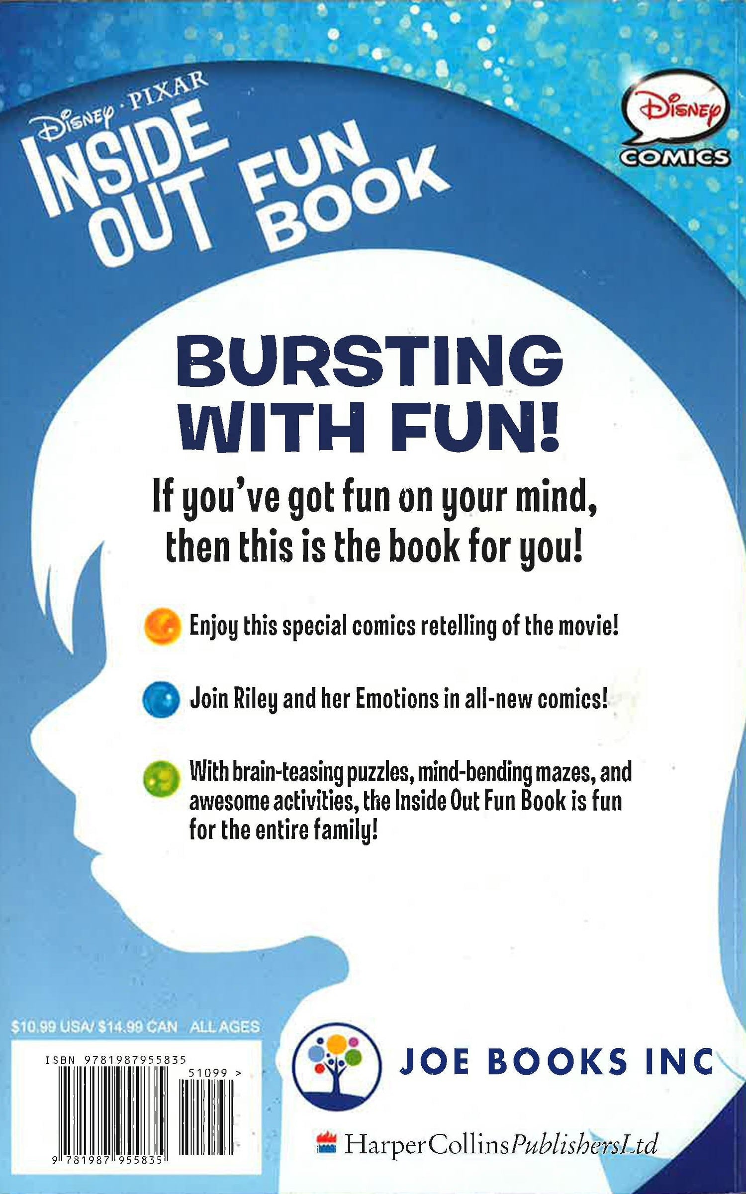BURSTING WITH FUN! If you've got fun on your mind, then this is the book for you! Enjoy this special comics retelling of the movie! Join Riley and her Emotions in all-new comics! With brain-teasing puzzles, mind-bending mazes, and awesome activities, the Inside Out Fun Book is fun for the entire family!