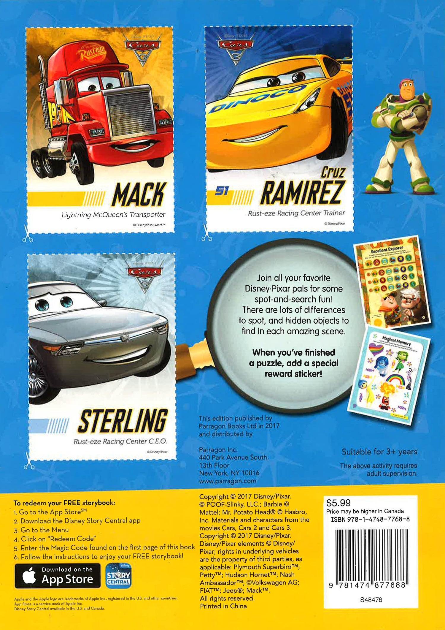 Join Woody, Joy, Dory and even Disney Pixar Cars 3 characters like Jackson Storm for some spot-and-search fun! There are lots of differences to spot and hidden objects to find in each amazing scene. When you've finished a puzzle, add a special reward sticker. This book comes with 2 collectible trading cards as well as a bonus code for a free Disney digital storybook.