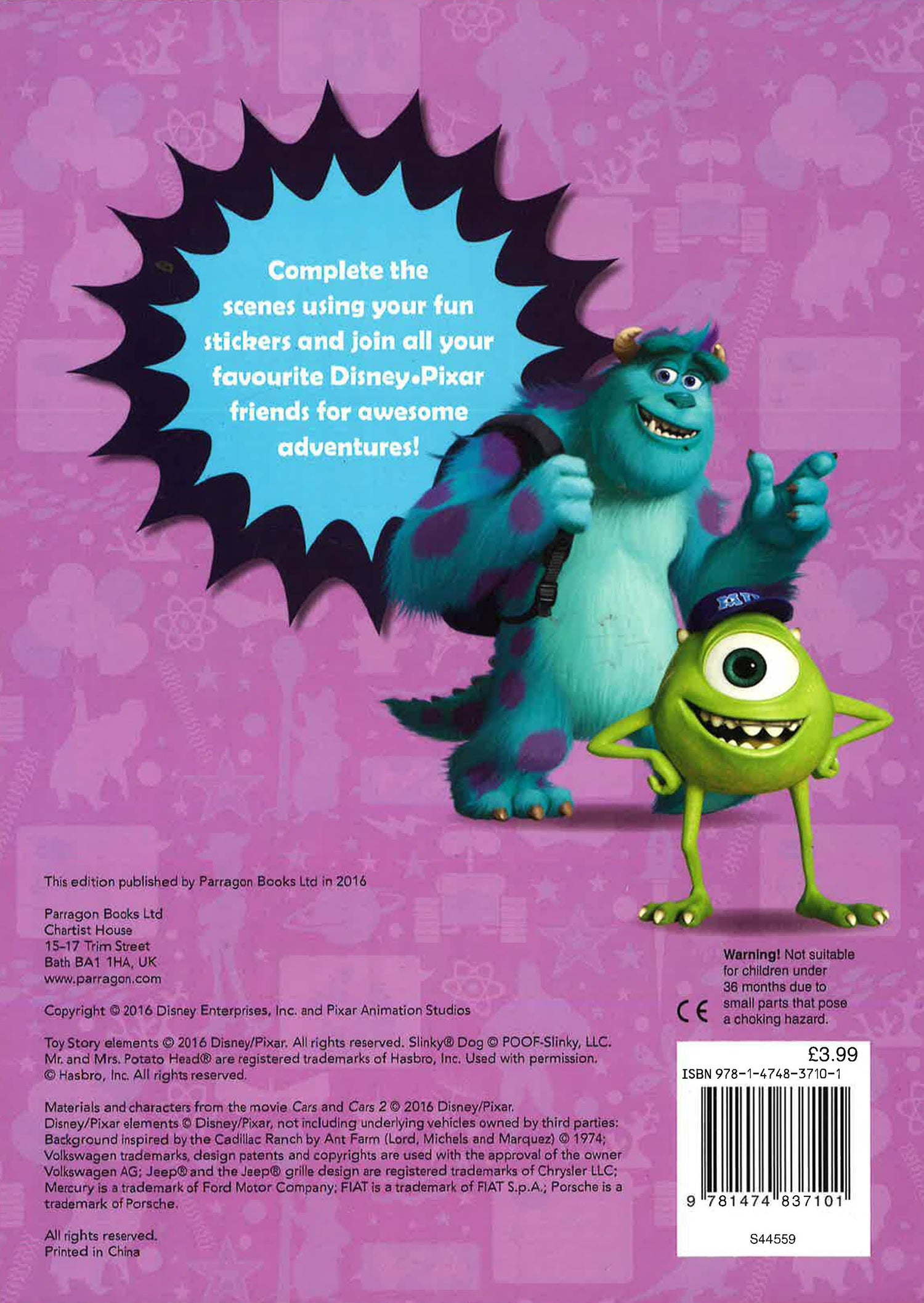 Join Nemo, Sulley, Lightning and more in this fun sticker adventure. Use over 40 stickers to complete the scenes.