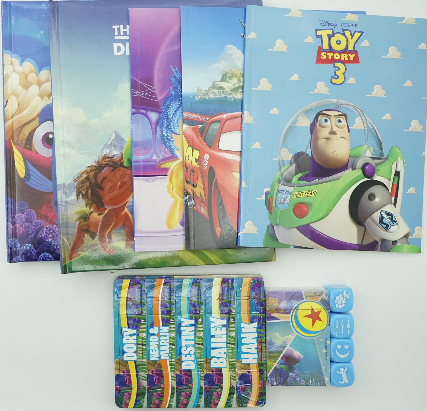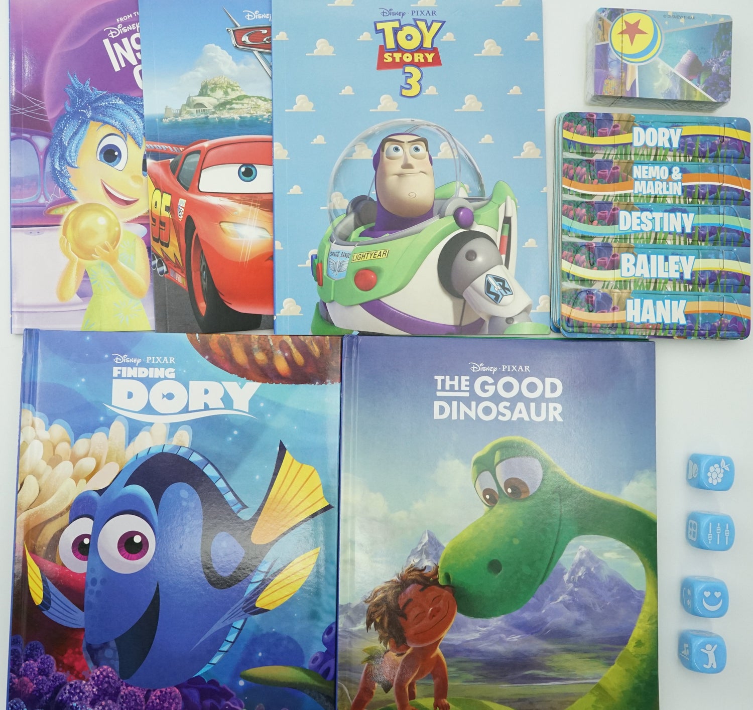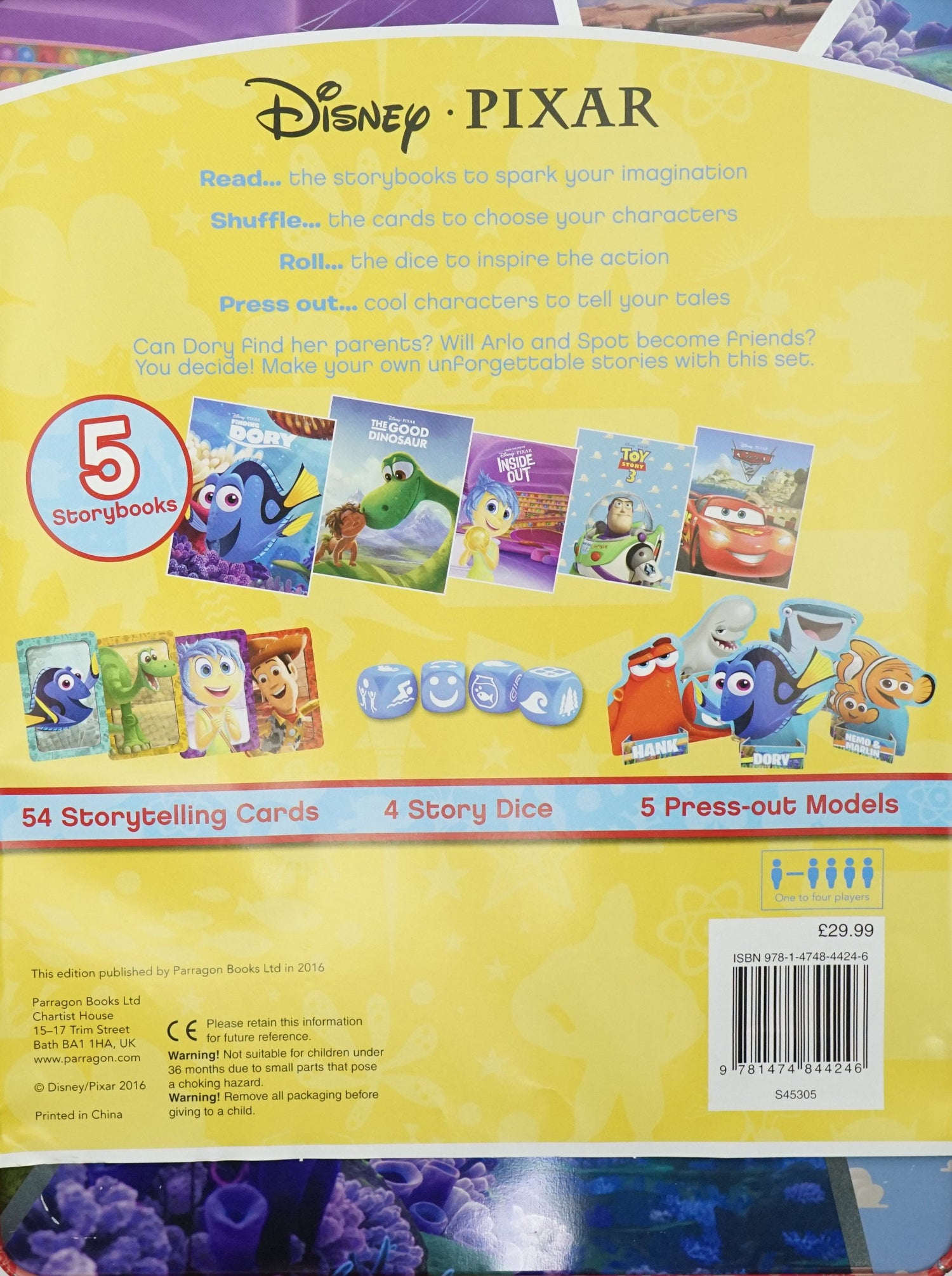 Disney Pixar Storytelling Adventures is filled with 5 storybooks, 4 story dice, 54 storytelling character game cards, and press-out character models with stands!