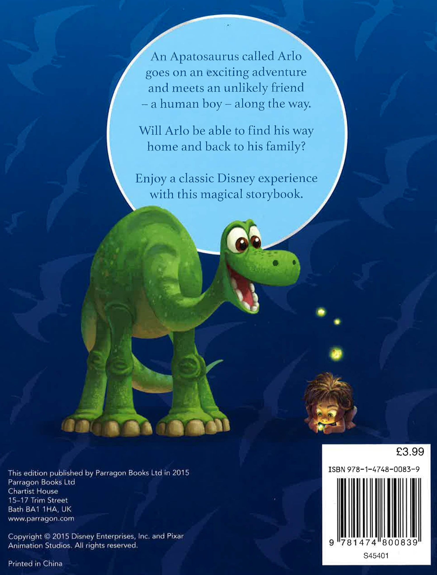 An Apatosaurus called Arlo goes on an exciting adventure and meets an unlikely friend-a human boy-along the way. Will Arlo be able to find his way home and back to his family?Enjoy a classic Disney Pixar experience with this magical storybook, featuring a holographic moving image on the cover and beautiful artwork on every page.
