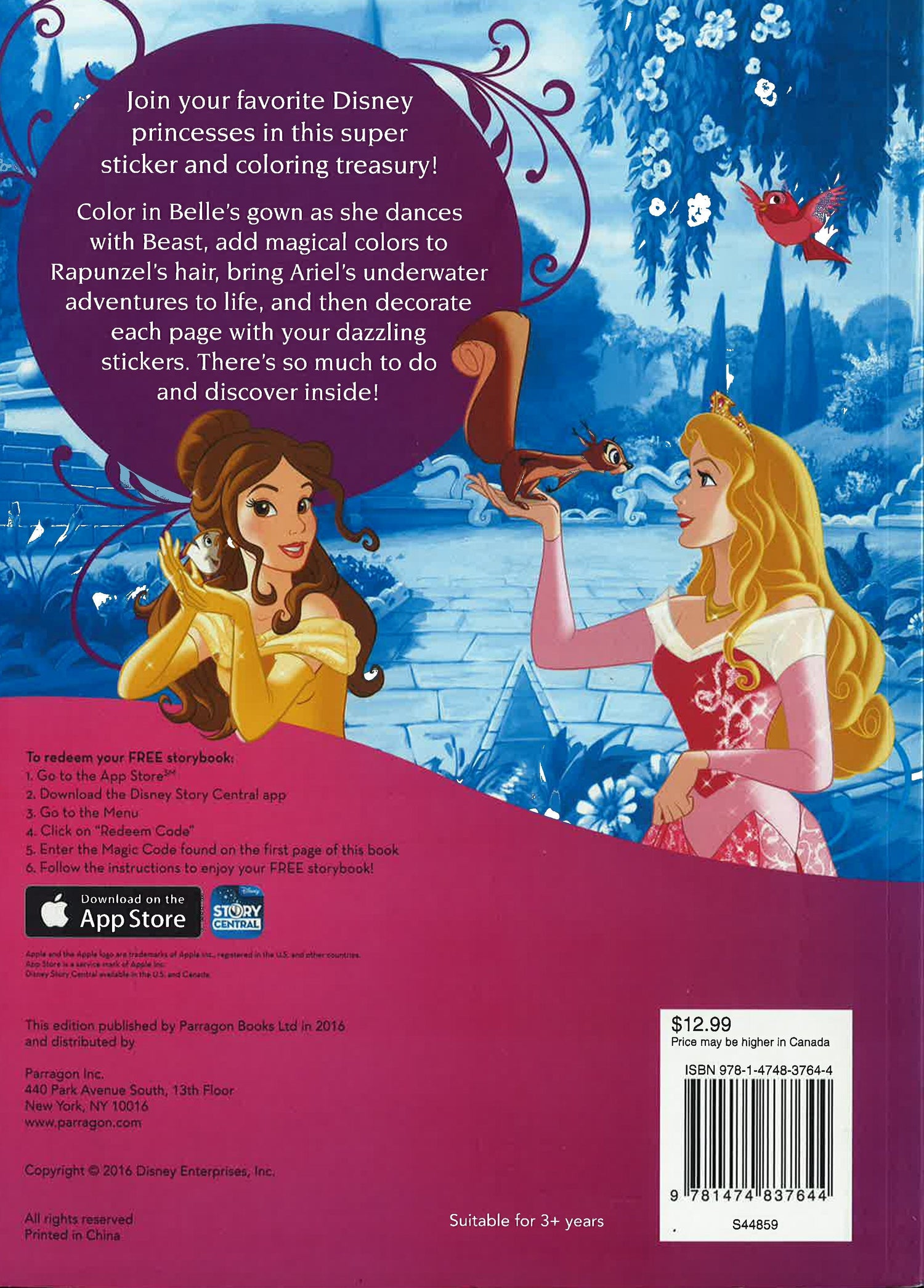 Join Rapunzel, Ariel, Belle, Snow White, Sleeping Beauty and Cinderella for hours of Disney Princess fun with this sticker and coloring treasury! The book features over a thousand beautiful stickers, including silhouettes and jewels, crowns and castles, as well as all your favorite Disney Princesses, and a bonus code for a free digital storybook. Perforated pages make it easy to remove and display the pictures.