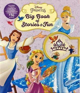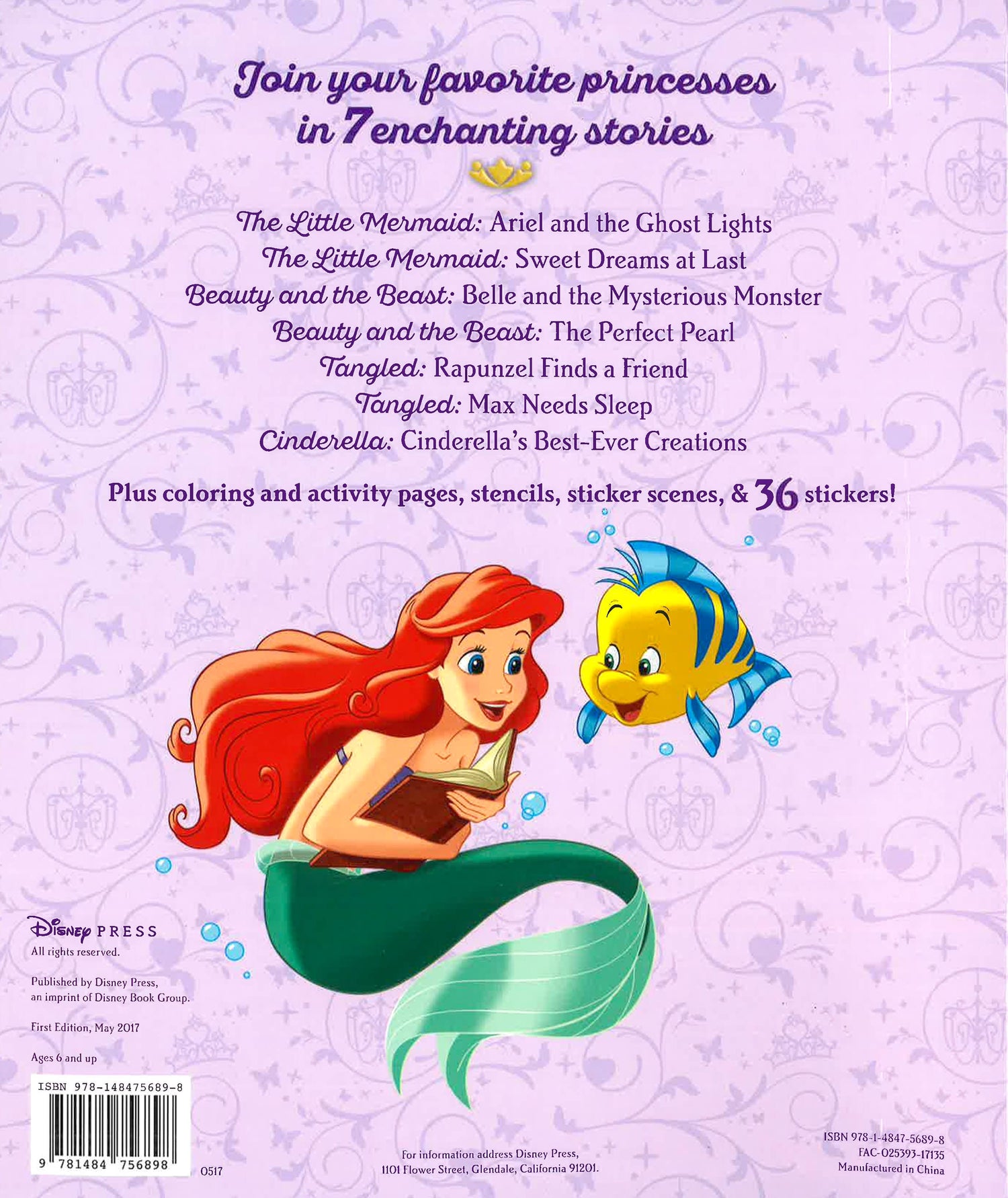 New hardcover activity book features Ariel, Belle, Rapunzel, and Cinderella. It includes 7 stories, coloring and activity pages, 2 sheets of stencils, 4 sticker scenes, and 36 stickers.