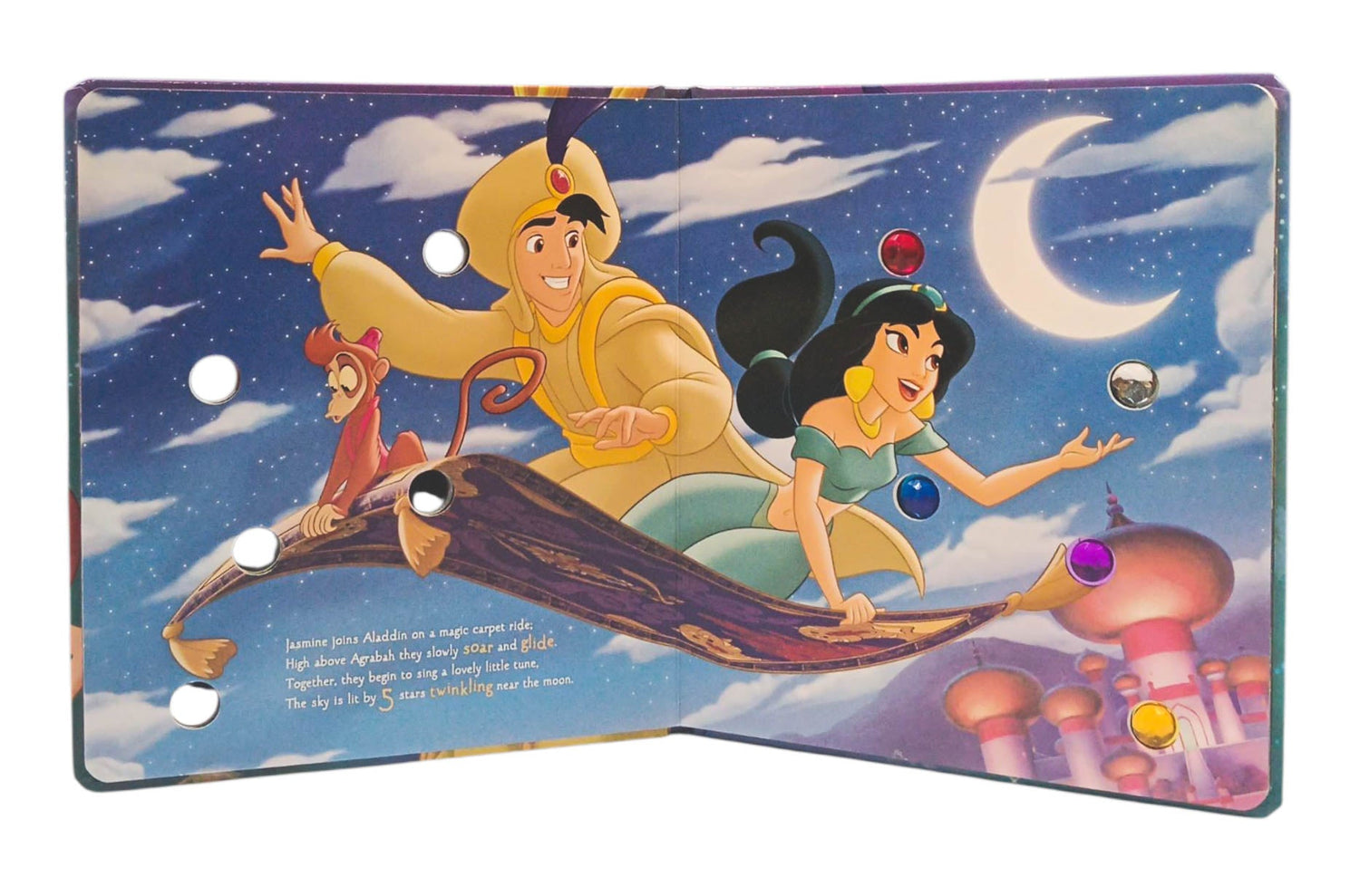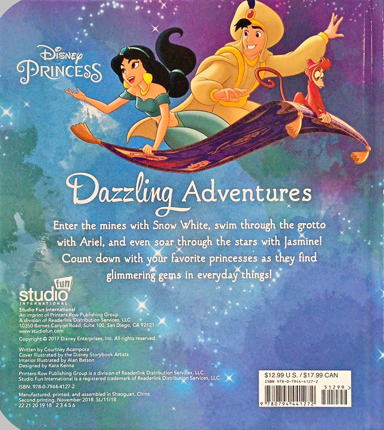 Swim through the grotto with Ariel, and soar through the stars with Jasmine! Count down with your favorite princesses as they find glimmering gems in everyday things! Includes Ariel, Snow White, Jasmine, Belle, Tiana, Aurora, Merida, and Rapunzel.