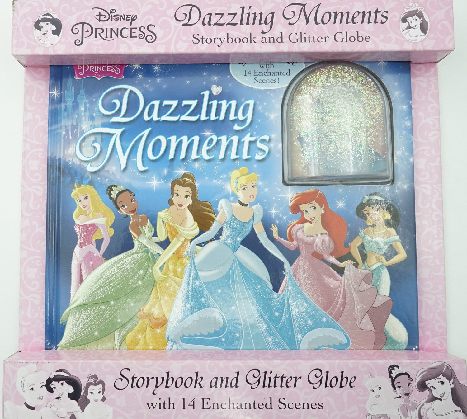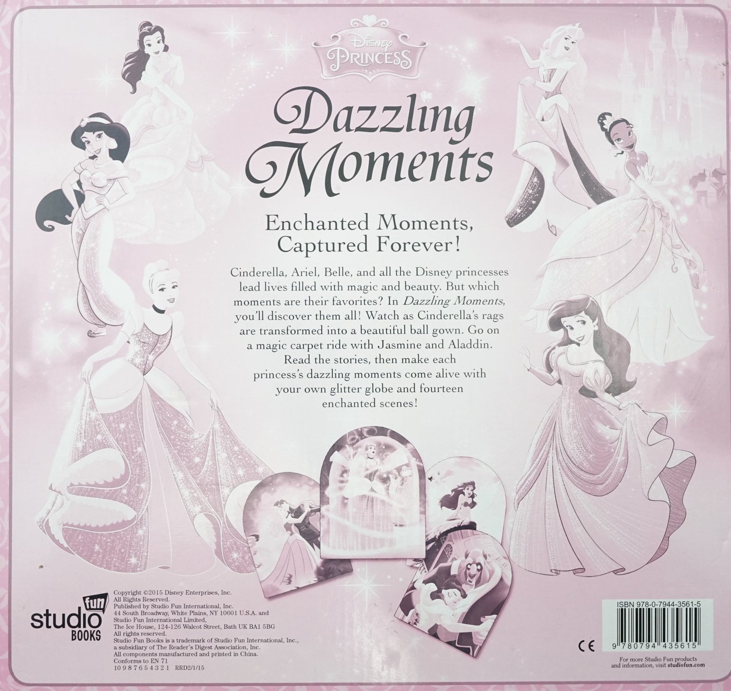 This enchanting book featuring Ariel, Cinderella, Aurora, Tiana, Jasmine, and Belle comes with a real glitter snow globe and press-out cards that can be inserted to change the scene inside. Experience all the special moments from your favorite Disney Princess stories--in a beautiful storybook and a real glitter snow globe. Simply use the seven double-sided cards to change the images inside the glitter globe, and create fourteen glittering scenes such as Cinderella's magical transformation, Aurora's kiss with Prince Phillip, Tiana kissing the frog, the Beast becoming the Prince, Cinderella's wedding, or Ariel emerging from the water in her beautiful gown to be reunited with Prince Eric. They can even slip a photograph of family or friends into the glitter globe for a glittery keepsake! The glitter snow globe can sit on a shelf or be hung from a string to decorate a coat hook, a window, or even on a holiday tree!