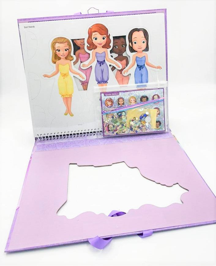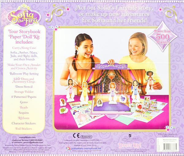 Sofia the First themed fun including: 5 paper dolls, 5 doll-size storybooks, castle fold-out play scene, cut-and create Amulet of Avalor, storage envelope, dress and accessory clings, and more.