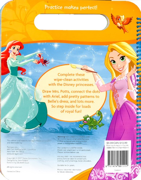 Young children will have lots of royal fun with their favorite Disney princesses as they complete this Disney Princess Wipe-Clean Activity Book. Readers can draw Mrs. Potts, connect the dots with Ariel, add pretty patterns to Belle's dress plus lots more. When the book is complete, simply wipe the pages clean and start again!