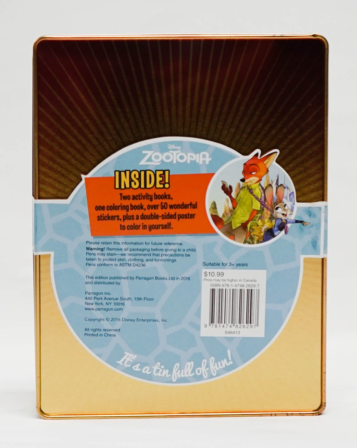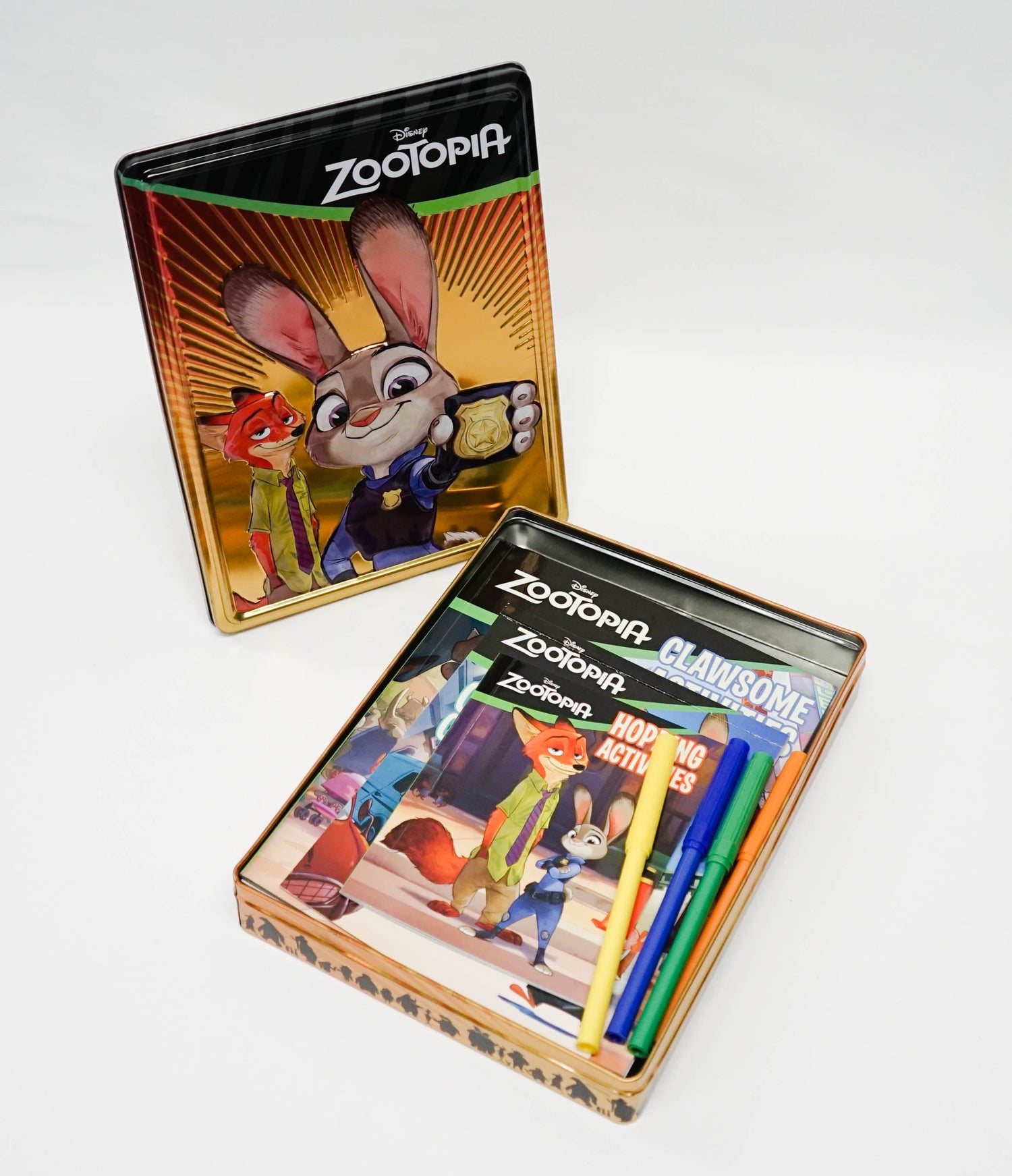 Join Judy Hopps and Nick Wilde from the Disney film Zootopia for some fantastic adventure fun! Inside this paw-fect collectable tin you'll discover two claw-some activity books and a cool coloring book, as well as a double-sided poster for you to color, 50 wonderful stickers, and 4 markers. It's a tin full of fun!