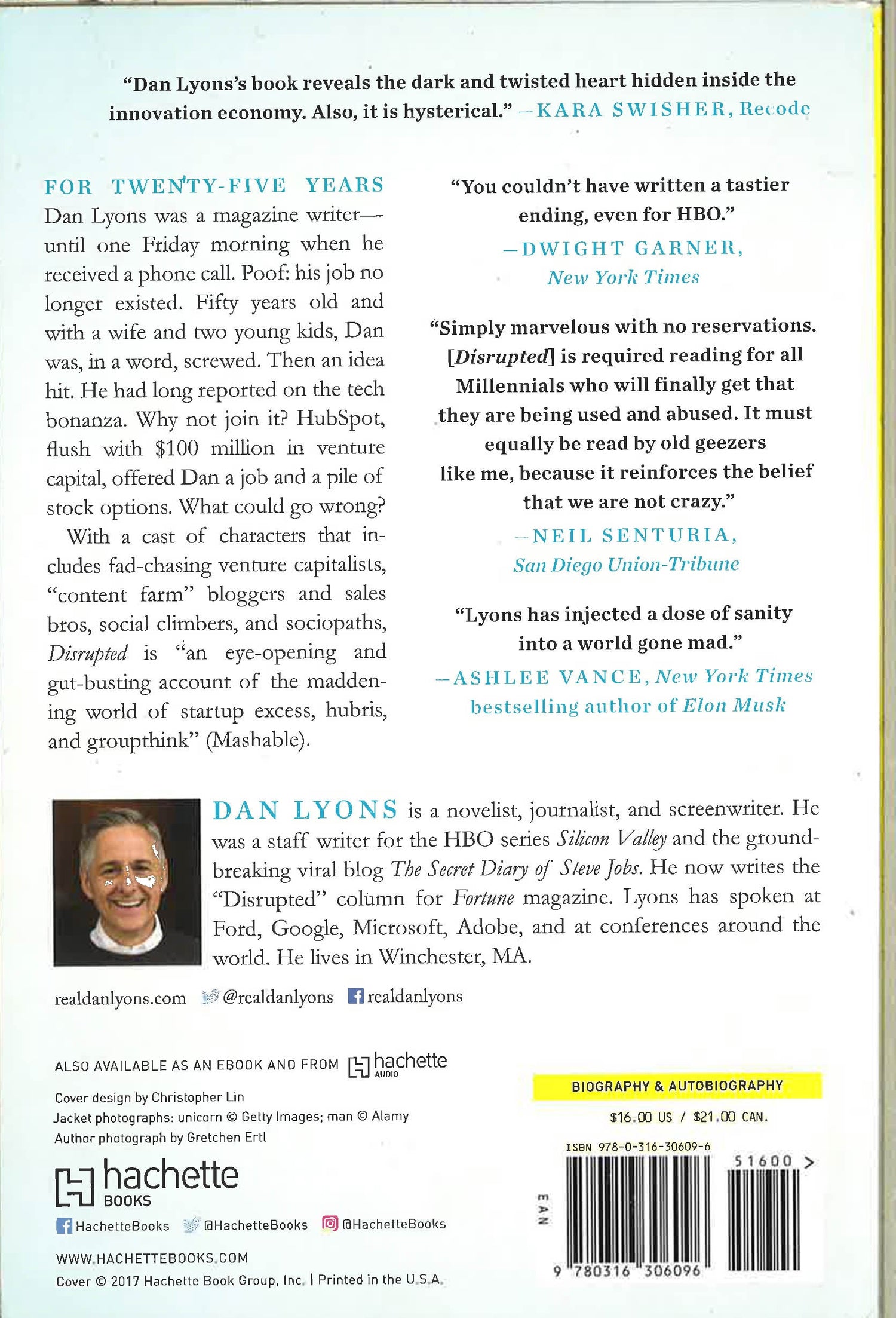 For twenty-five years Dan Lyons was a magazine writer at the top of his profession--until one Friday morning when he received a phone call: Poof. His job no longer existed. "I think they just want to hire younger people," his boss at Newsweek told him. Fifty years old and with a wife and two young kids, Dan was, in a word, screwed. Then an idea hit. Dan had long reported on Silicon Valley and the tech explosion. Why not join it? HubSpot, a Boston start-up, was flush with $100 million in venture capital. They offered Dan a pile of stock options for the vague role of "marketing fellow." What could go wrong? HubSpotters were true believers: They were making the world a better place . . . by selling email spam. The office vibe was frat house meets cult compound: The party began at four thirty on Friday and lasted well into the night; "shower pods" became hook-up dens; a push-up club met at noon in the lobby, while nearby, in the "content factory," Nerf gun fights raged. Groups went on "walking meetings," and Dan's absentee boss sent cryptic emails about employees who had "graduated" (read: been fired). In the middle of all this was Dan, exactly twice the age of the average HubSpot employee, and literally old enough to be the father of most of his co-workers, sitting at his desk on his bouncy-ball "chair."Mixed in with Lyons's uproarious tale of his rise and fall at Hubspot is a trenchant analysis of the start-up world, a de facto conspiracy between those who start companies and those who fund them, a world where bad ideas are rewarded with hefty investments, where companies blow money lavishing perks on their post-collegiate workforces, and where everybody is trying to hang on just long enough to reach an IPO and cash out. With a cast of characters that includes devilish angel investors, fad-chasing venture capitalists, entrepreneurs and "wantrapreneurs," bloggers and brogrammers, social climbers and sociopaths, Disrupted is a gripping and definitive account of life in the (second) tech bubble.