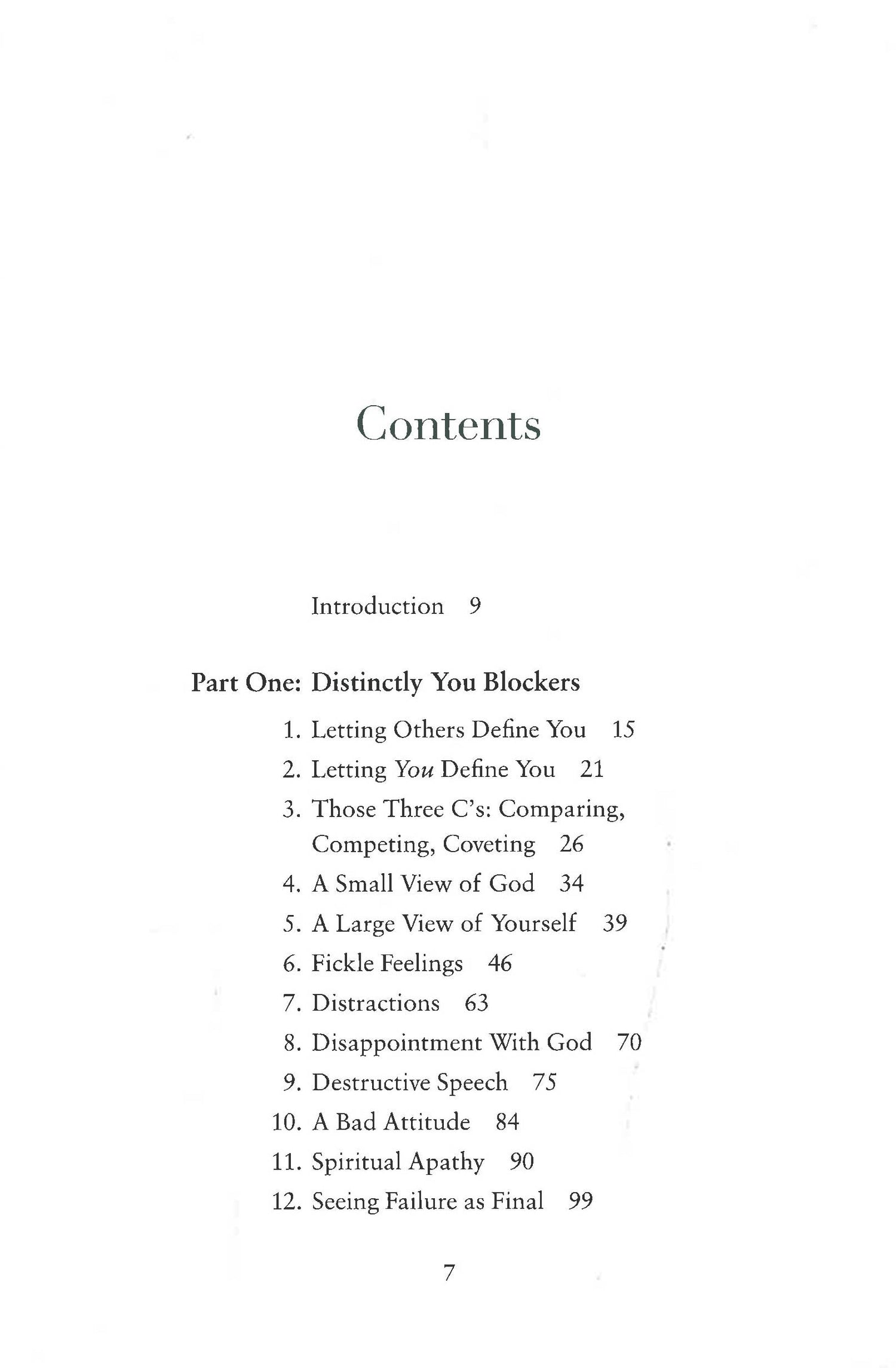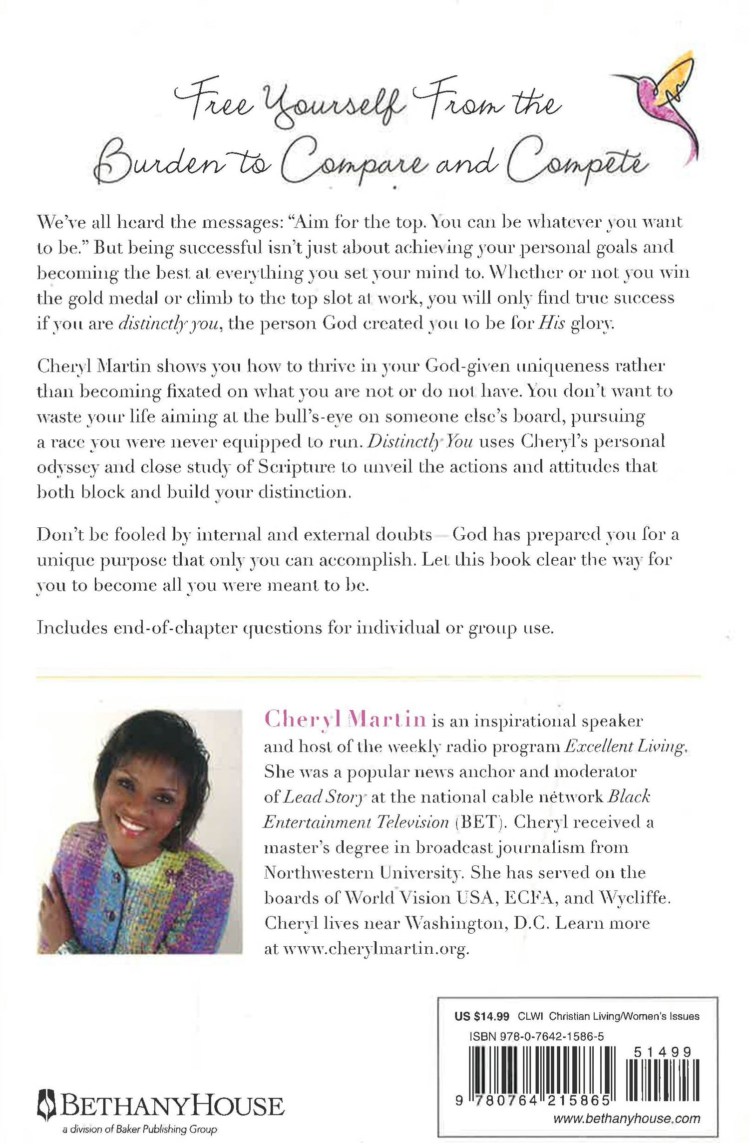 For Women Who Want More Than Comparing, Competing, and Coveting All of creation is content to be what it was made to be except us. Fish flourish in water. Ants are not worried about their size. But we waste time on the three C's--comparing, competing, coveting. We aim at the bull's-eye on someone else's board, pursuing a race we weren't equipped to run. Cheryl Martin shows women how to develop their God-given uniqueness rather than becoming fixated on what they are not or do not have. Distinctly You unveils the actions and attitudes that may be sabotaging women and explores ways women can engage and build up their unique talents, interests, and strengths. Readers will be inspired by examples in the Old and New Testaments of people who were exceptional for God's kingdom. As the author shares her ongoing quest to be distinct for his glory, readers see how God created them to thrive. Includes end-of-chapter questions for individual or group use.