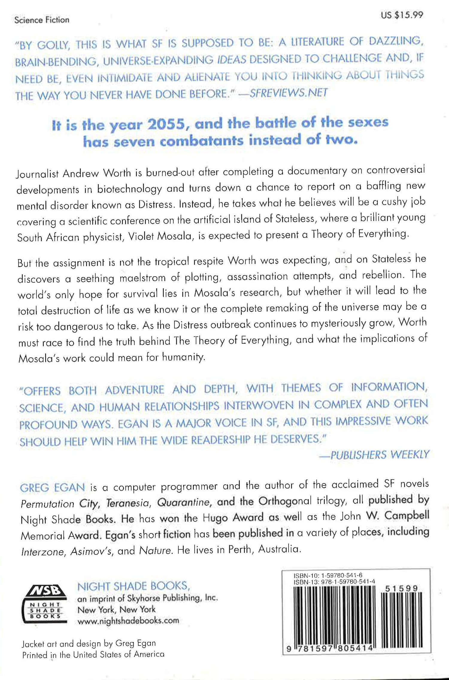 All right. He's dead. Go ahead and talk to him. It is the year 2055, and the battle of the sexes has seven combatants rather than two. "The illusion of empathy" has been dispensed with, and a few idealistic souls try to create a utopia with pirated technology. But a wired journalist, Andrew Worth, doesn't want any part of the pop "Frankenscience" regularly dished out to the masses. Burned-out after completing a documentary on controversial developments in biotechnology, he turns down a chance to report on a baffling new mental disorder known as Distress and instead takes an assignment covering the Einstein Centenary Conference on the artificial island of Stateless. There, a young South African physicist, Violet Mosala, is expected to unveil her candidate for a Theory of Everything. But the assignment is not the tropical respite Worth was expecting. Unfortunately academia's facade of civility is dangerously cracked with a seething maelstrom of plotting, assassination attempts, and rebellion, and Worth is dragged down into the nightmare. The world's only hope for survival lies in Violet Mosala's development of a final Theory of Everything, but whether it will lead to the total destruction of life as we know it or the complete remaking of the universe may be a risk too dangerous to take. Greg Egan's audacious voice and literary scope create a fragmented futuristic world where technology and bioengineering threaten humanity's very existence. Skyhorse Publishing, under our Night Shade and Talos imprints, is proud to publish a broad range of titles for readers interested in science fiction (space opera, time travel, hard SF, alien invasion, near-future dystopia), fantasy (grimdark, sword and sorcery, contemporary urban fantasy, steampunk, alternative history), and horror (zombies, vampires, and the occult and supernatural), and much more. While not every title we publish becomes a New York Times bestseller, a national bestseller, or a Hugo or Nebula award-winner, we are committed to publishing quality books from a diverse group of authors.