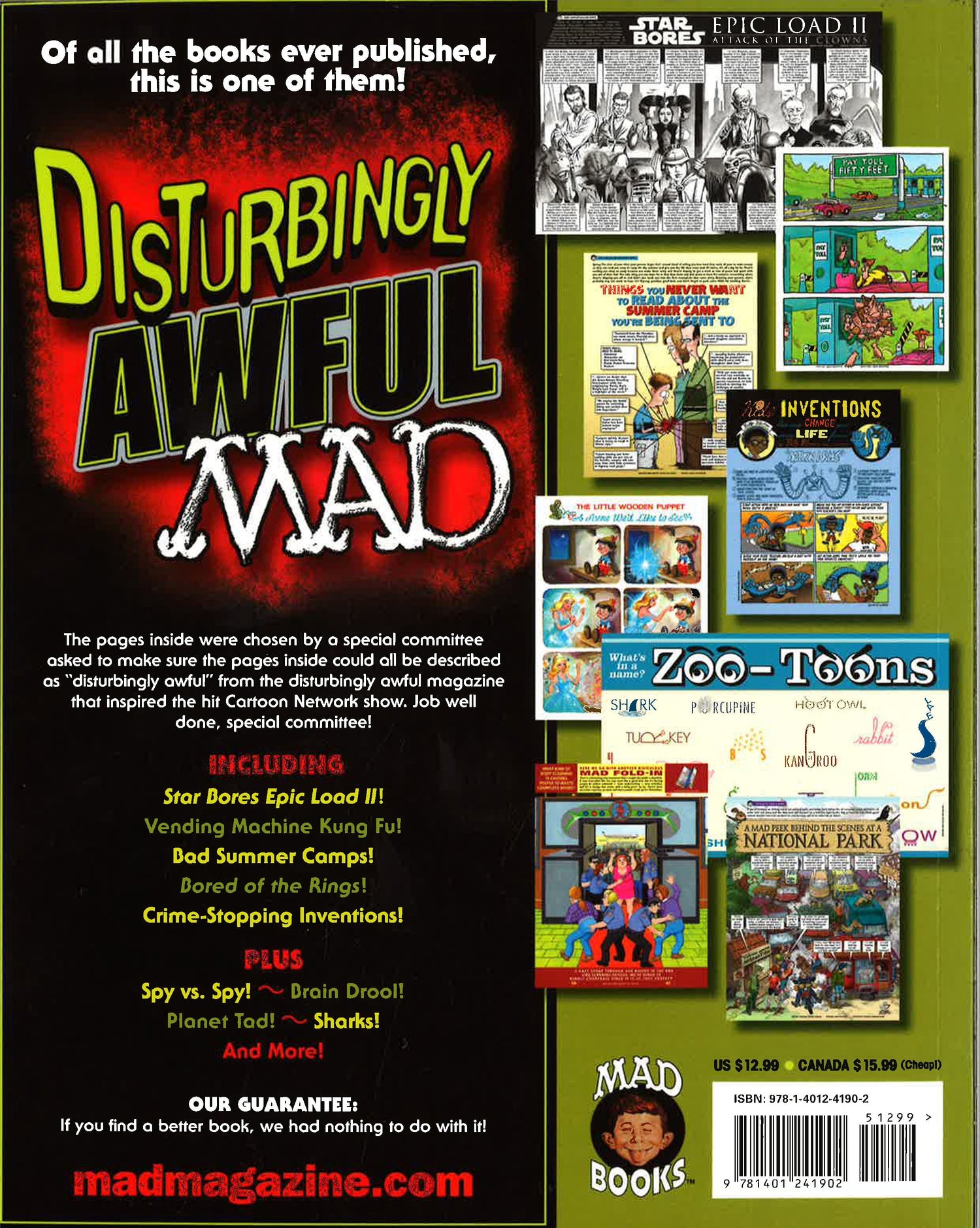 Disturbingly Awful MAD includes our silly spoofs of Star Wars Episode II: Attack of the Clones and The Lord of the Rings: The Two Towers! Plus, six Spy vs. Spy encounters, the MAD Hate Book, Planet Tad, Looks at Swimming Pools and Summer Camp, Outrageous Don Martin Cartoons, and visits with our band of stooge - Willy Nilly, Dwayne, Duke Bissell, Billy Blevins, and Wanda Goldstein Flenkman: Animal Psychologist! All from the magazine that inspired the hit Cartoon Network show!