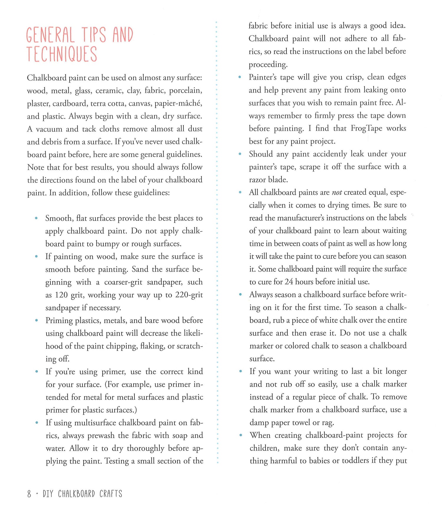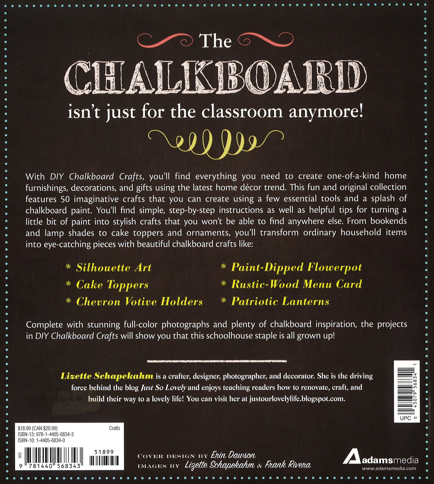 With DIY Chalkboard Crafts, you'll find everything you need to create one-of-a-kind accessories, decorations, and gifts using the latest home decor trend. This fun and original collection features 50 imaginative crafts that you can create using a few essential tools and a splash of chalkboard paint. You'll find simple, step-by-step instructions as well as helpful tips for turning a little bit of paint into stylish crafts that you won't be able to find anywhere else. From bookends and lampshades to cake toppers and ornaments, you'll transform ordinary household items into eye-catching pieces with beautiful chalkboard crafts like: Cake-Silhouette Table Runner Chevron Votive Holders Paint-Dipped Flowerpot Rustic-Wood Menu Card Patriotic Lanterns Complete with stunning, full-color photographs and plenty of chalkboard inspiration, the projects in DIY Chalkboard Crafts will show you that this schoolhouse staple is all grown up!