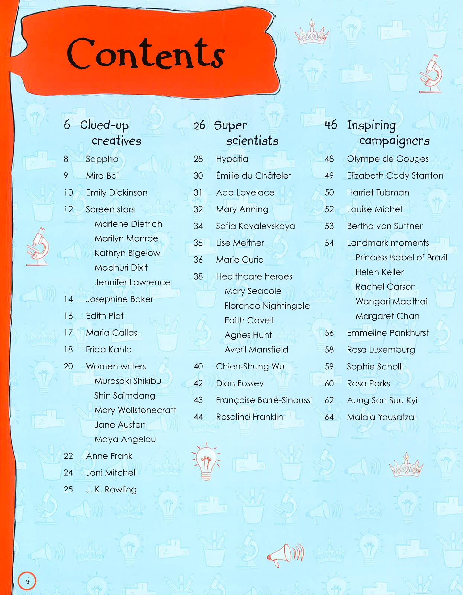 This brilliant book celebrates the incredible contribution of women in every walk of life, from politics, science, and business to sport, art, and literature. The leading ladies include sister suffragette Emmeline Pankhurst, super scientist Marie Curie, human rights heroine Eleanor Roosevelt, tennis champ Serena Williams, painting pioneer Frida Kahlo, and writing wizard J.K. Rowling.