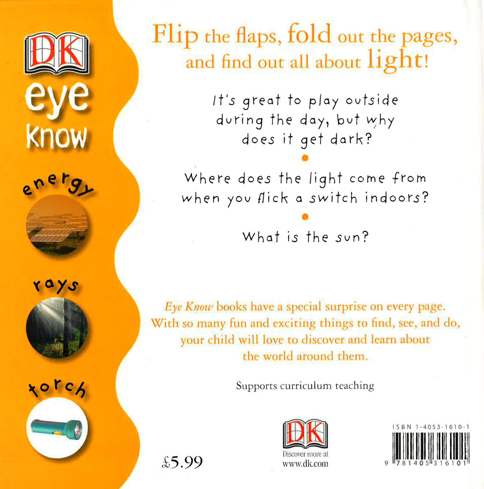 Lamps help me see in the dark, but how do they work? The Sun gives out light but what is it? How far away is it? This work introduces learning about light from a starting point that your child will already know, encouraging them to find out about their daily life and the world around them.Discovery starts with a single word - Light'I know what light is. Light comes from the Sun, from a light bulb, and from candles. What else do I know about light?' Learning about light is introduced from a starting point that your child will already know, encouraging them to find out about their daily life and the world around them.Lamps help me see in the dark, but how do they work? The Sun gives out light but what is it? How far away is it?Those are the facts, now for the fun - Eyeknow have a surprise on every page; your child will love getting involved in the activities as they flip the flaps, peep though holes and fold out pages.