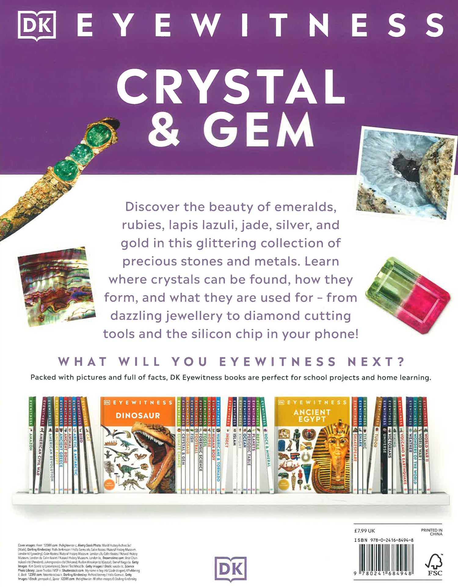 Learn all about sparkling gemstones and eye-catching crystals in this handy reference guide for young readersFrom the rarest crystal to the most common stone, gems from around the world are revealed in dazzling detail in this illustrated guide. Discover what exactly crystals and gems are, how they're formed, how to identify them, and how they can be used in everything from microchips to jewellery making.How can a rough diamond become a show-stopping centrepiece? Where does labradorite get its colours? Why are there quartz crystals in clocks and watches? How can crystals be grown in a laboratory?Packed with essential information, this edition is more interactive than ever with new infographics, statistics, and facts. Readers will also get a giant fold-out wall chart packed with crystals and details about their uses, which serves as a useful reference tool on your bedroom or classroom wall. Eyewitness Crystal & Gem is the perfect guide for homework help on crystals or for those who simply want to further their knowledge of these fabulous natural creations.Part of DK's best-selling Eyewitness series, which is now getting an exciting makeover, this popular title has been reinvigorated for the next generation of information-seekers and stay-at-home explorers, with a fresh new look, new photographs, updated information, and a new "eyewitness" feature - fascinating first-hand accounts from experts in the field.