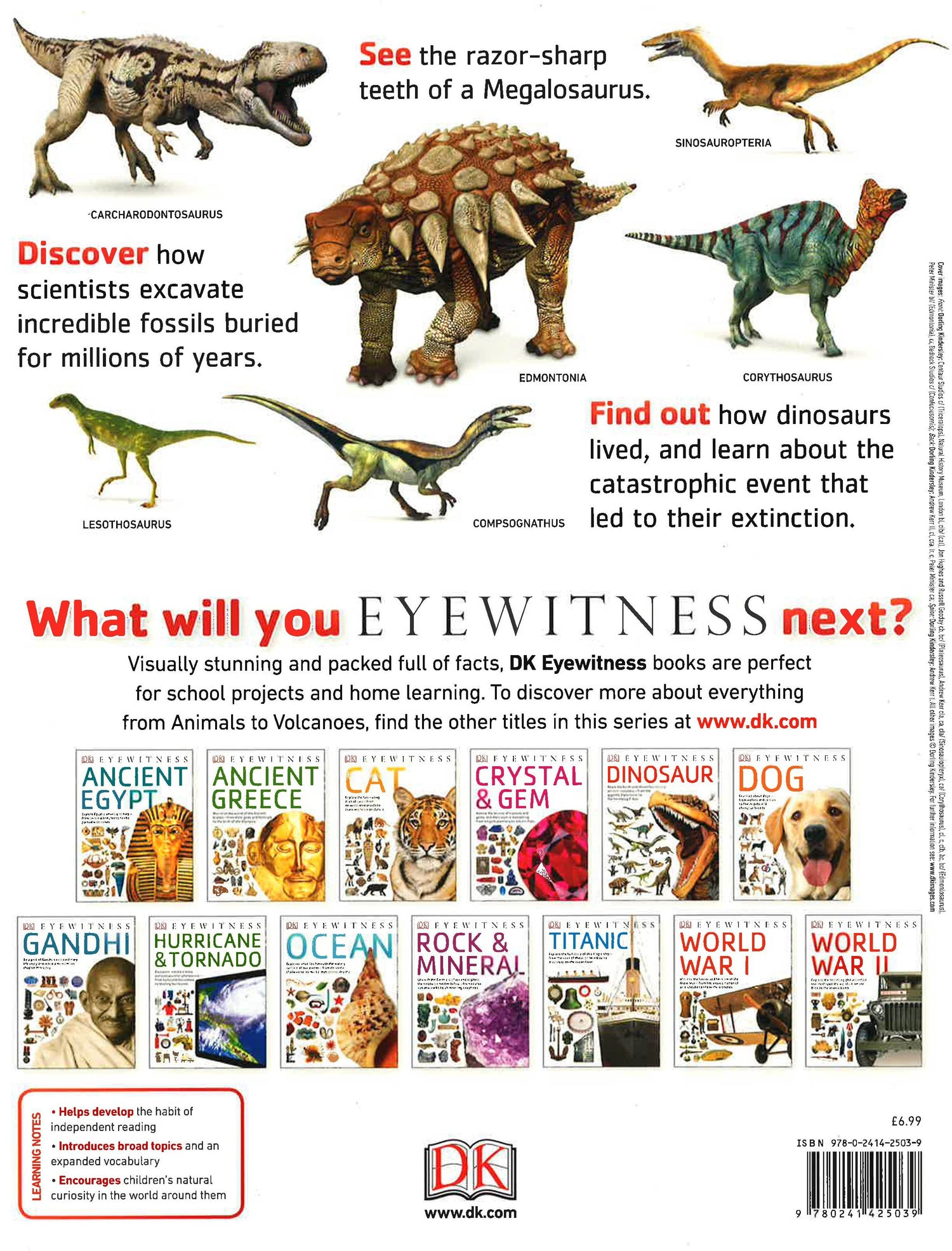 Did you know that Therizinosaurus had a claw longer than a man's arm? Did you know it only used its terrifying claws for eating plants? From the tiny, chicken-sized Compsognathus to the mighty Brachiosaurus reaching for food in the treetops, Eyewitness Dinosaur unearths fascinating facts about these amazing prehistoric creatures. Learn about different types of dinosaurs and their body parts, diets, senses, evolution, and more. Discover how we know so much about them just from examining what they've left behind, including footprints, bones... and droppings. This is the perfect guide for dinosaur lovers, and great for projects or homework help - with colourful and factual illustrations, and lots of labels and statistics to break down the information into easy bite-sized chunks. It also includes a giant fold-out wall chart full of facts, great for your bedroom wall or classroom. Take a trip through the Triassic, Jurassic, and Cretaceous periods and enjoy learning all there is to know about your favourite ancient monsters.