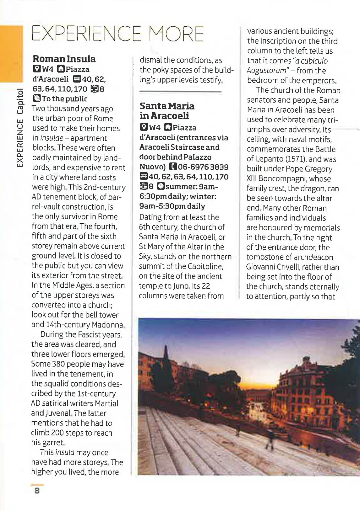- Chapters covering Capitol; Forum and Palatine; Piazza della Rotonda; Piazza Navona; Piazza di Spagna and Villa Borghese; Campo de' Fiori; Quirinal and Monti; Esquiline; Lateran; Caracalla; Aventine; Trastevere; Janiculum; Vatican; Via Veneto