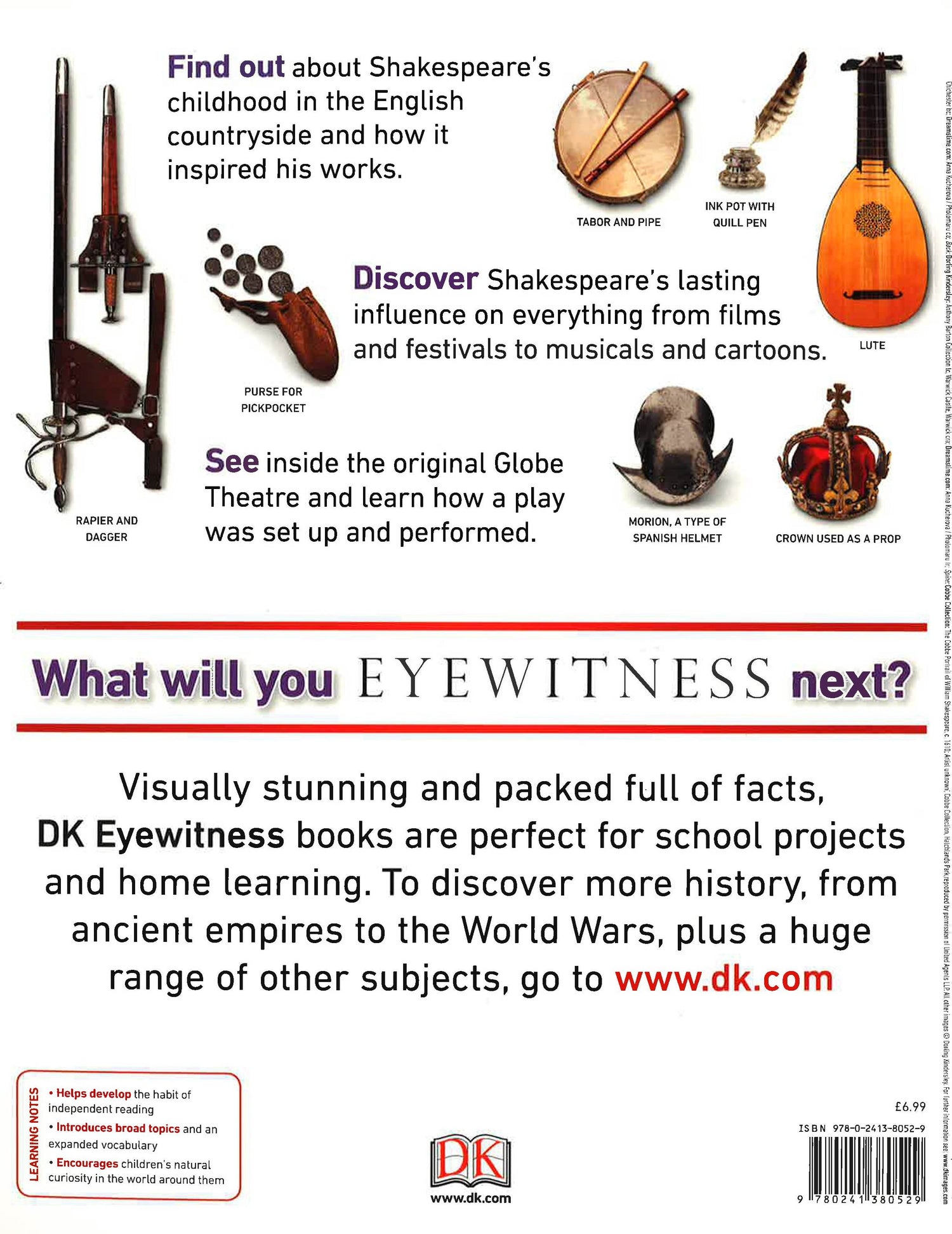 Whether your child has a special interest in theater, poetry, or the work of William Shakespeare, you're going to see a Shakespeare play as a family, or you want to add depth and additional resources to Shakespeare's work that your student is studying in the classroom, Eyewitness: Shakespeare is the ideal choice for you and your child to get to know the bard even better. DK's Eyewitness series is perfect for children. It engages both readers and visual learners by presenting information with a combination of photography, small nuggets of information, and fact-packed annotation so children can really dig into topics without becoming overwhelmed. One picture at a time, Eyewitness books teach big subjects in easy ways. We've revamped our Eyewitness series to be even better with solid facts, shorter texts, more emphasis on images, and fresh new learning sections, making Eyewitness books the perfect way to encourage curiosity in your child or to supplement classroom learning.