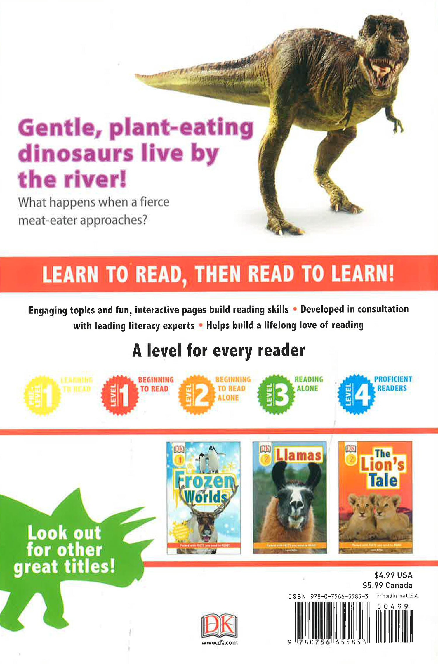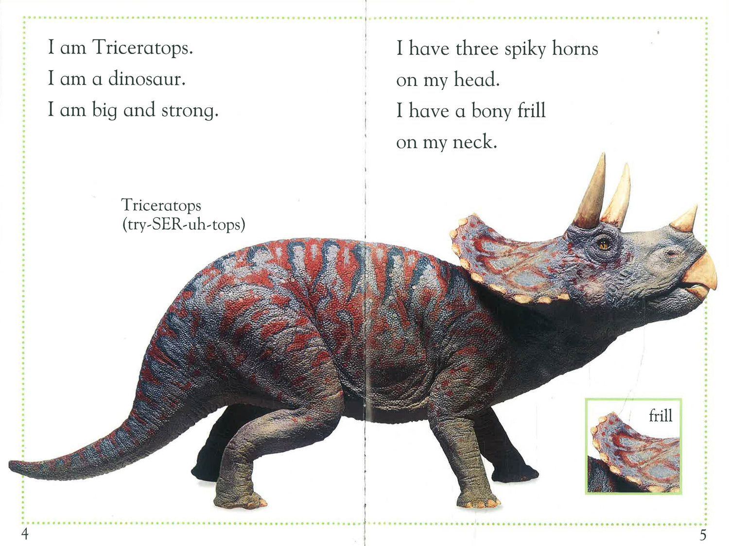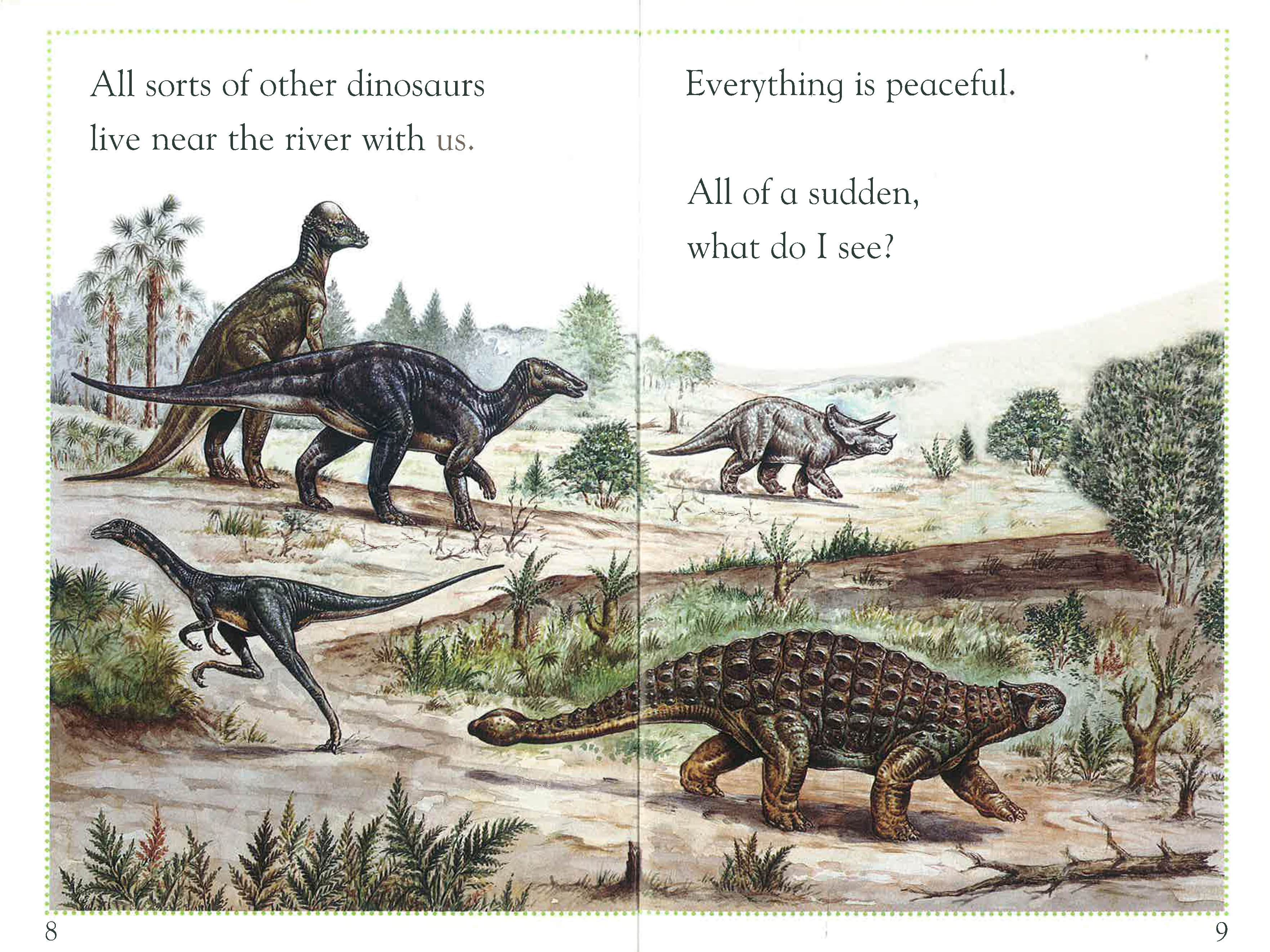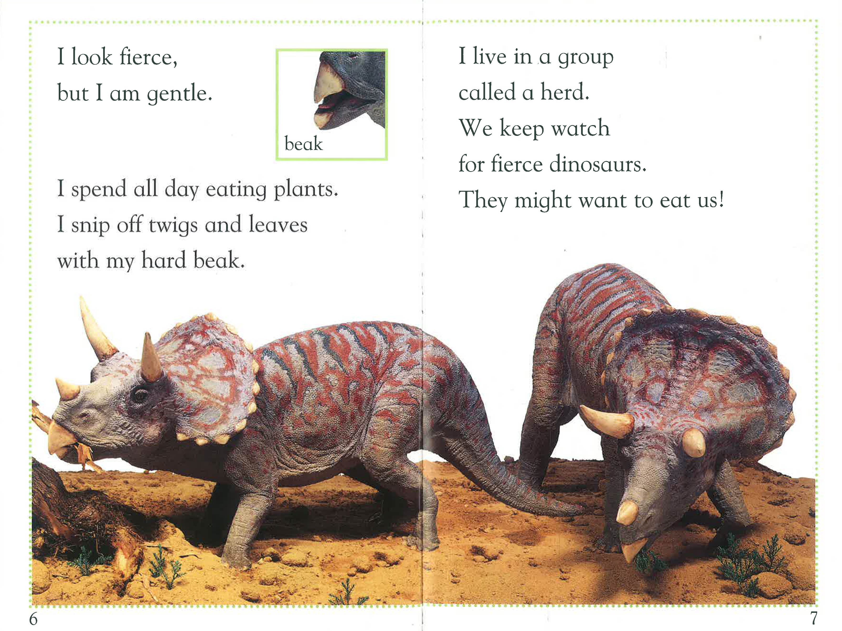 In this book, children follow a day in the life of a Triceratops, as he wanders away from his herd and has an encounter with a deadly Tyrannosaurus rex.
