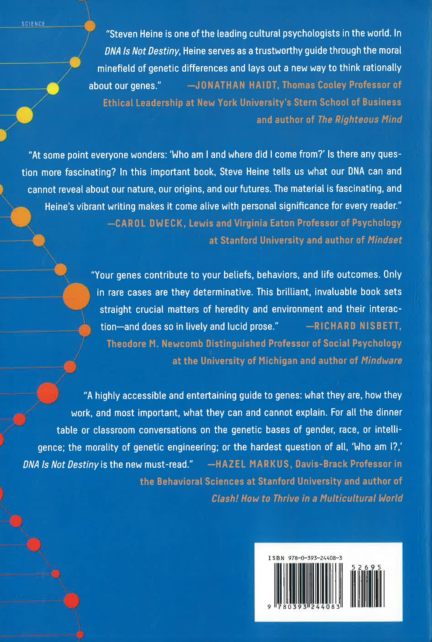 Do you fear what might be lurking in your DNA? Well, now you can find out, and you most likely will. Scientists expect one billion people to have their genomes sequenced by 2025, and as the price drops it may even become a standard medical procedure. Yet cultural psychologist Steven Heine argues that the first thing we’ll do upon receiving our DNA test results is to misinterpret them completely. We’ve become accustomed to breathless media coverage about newly discovered “cancer” or “IQ” or “infidelity” genes, each one promising a deeper understanding of what makes us tick. But as Heine shows, most of these claims are oversimplified and overhyped misinterpretations of how our DNA really works. With few exceptions, it is a complex combination of experience, environment, and genetics that determines who we are, how we behave, and what diseases will afflict us in the future. So why do we continue to buy into the belief that our genes control our destiny? Heine argues that we are psychologically ill equipped to deal with DNA results, repeatedly falling into predictable biases―switch-thinking, essentialism, fatalism, negativity dominance, and more―that mold our thinking about the information we receive. Heine shares his research―and his own genome-sequencing results―to not only to set the record straight regarding what your genes actually reveal about your health, intelligence, ethnic identity, and family, but to also help you counteract these insidious cognitive traps. His fresh, surprising conclusions about the promise, and limits, of genetic engineering and DNA testing upend conventional thinking and reveal a simple, profound truth: your genes create life―but they do not control it.