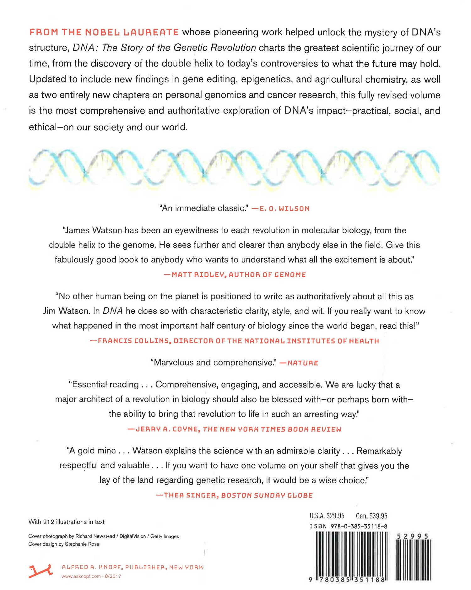 The definitive insider's history of the genetic revolution--significantly updated to reflect the discoveries of the last decade. James D. Watson, the Nobel laureate whose pioneering work helped unlock the mystery of DNA's structure, charts the greatest scientific journey of our time, from the discovery of the double helix to today's controversies to what the future may hold. Updated to include new findings in gene editing, epigenetics, agricultural chemistry, as well as two entirely new chapters on personal genomics and cancer research. This is the most comprehensive and authoritative exploration of DNA's impact--practical, social, and ethical--on our society and our world.