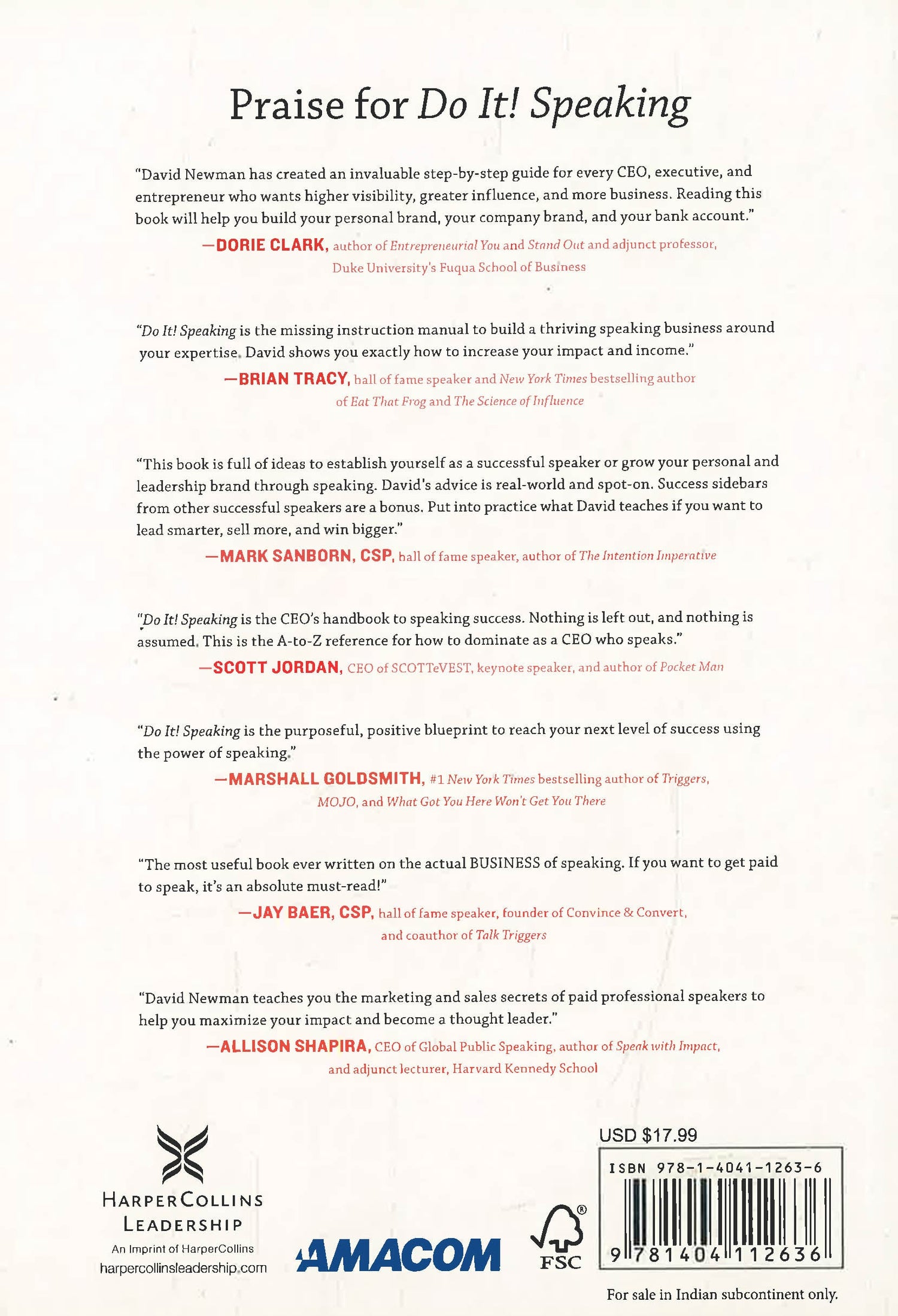 Do It! Speaking shows you the inside track on marketing, positioning, packaging, prospecting, outreach, sales, and how to get more and better speaking gigs on behalf of your company, your brand, and yourself. This book is the definitive guide on