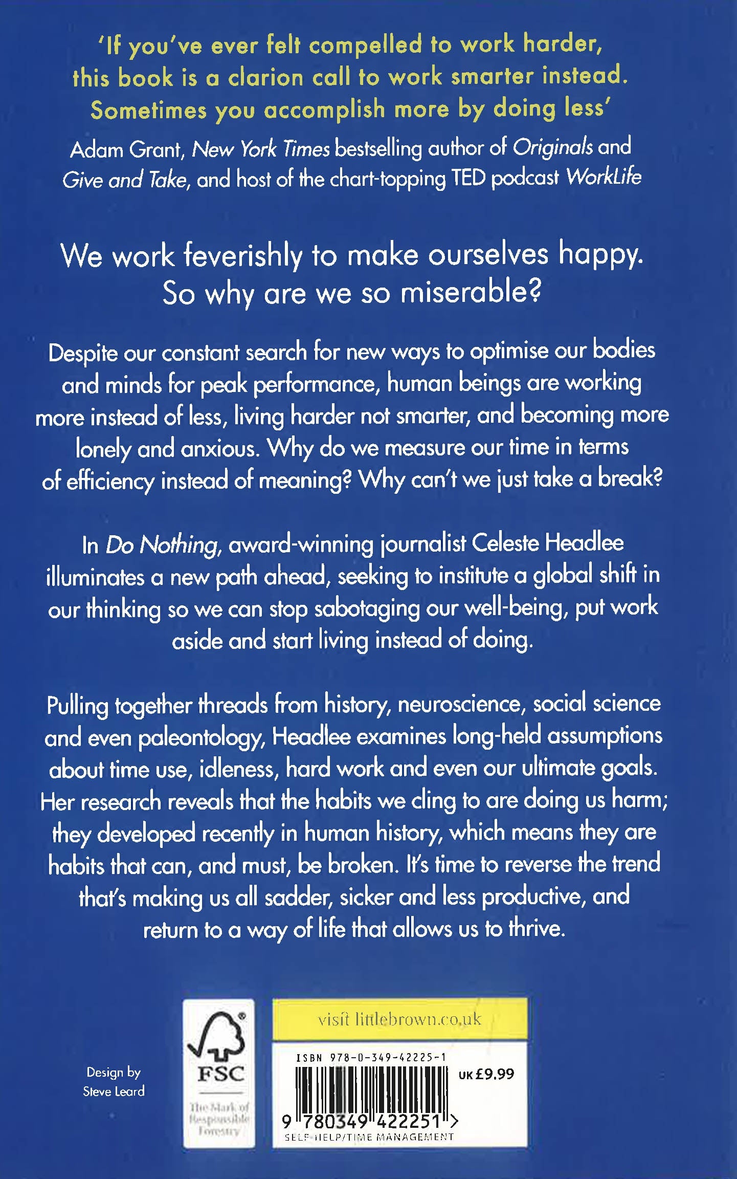 We work feverishly to make ourselves happy. So why are we so miserable? This manifesto helps us break free of our unhealthy devotion to efficiency and shows us how to reclaim our time and humanity.'This book is so important and could truly save lives . . . With intelligence and compassion, Headlee presents realistic solutions for how we can reclaim our health and our humanity from a technological revolution that seems hell-bent on destroying both. I'm so grateful to have read this book. It delivers on its promise of a better life' - Elizabeth Gilbert, bestselling author of Big Magic and Eat, Pray, LoveDespite our constant search for new ways to 'hack' our bodies and minds for peak performance, human beings are working more instead of less, living harder not smarter, and becoming more lonely and anxious. We strive for the absolute best in every aspect of our lives, ignoring what we do well naturally. Why do we measure our time in terms of efficiency instead of meaning? Why can't we just take a break?In Do Nothing, award-winning journalist Celeste Headlee illuminates a new path ahead, seeking to institute a global shift in our thinking so we can stop sabotaging our well-being, put work aside and start living instead of doing.The key lies in embracing what makes us human: our creativity, our social connections (Instagram doesn't count), our ability for reflective thought, and our capacity for joy. Celeste's strategies will allow you to regain control over your life and break your addiction to false efficiency, including:-Increase your time perception and determine how your hours are being spent.-Stop comparing yourself to others.-Invest in quality idle time. Take a hot bath and listen to music.-Spend face-to-face time with friends and familyIt's time to recover our leisure time and reverse the trend that's making us all sadder, sicker, and less productive.
