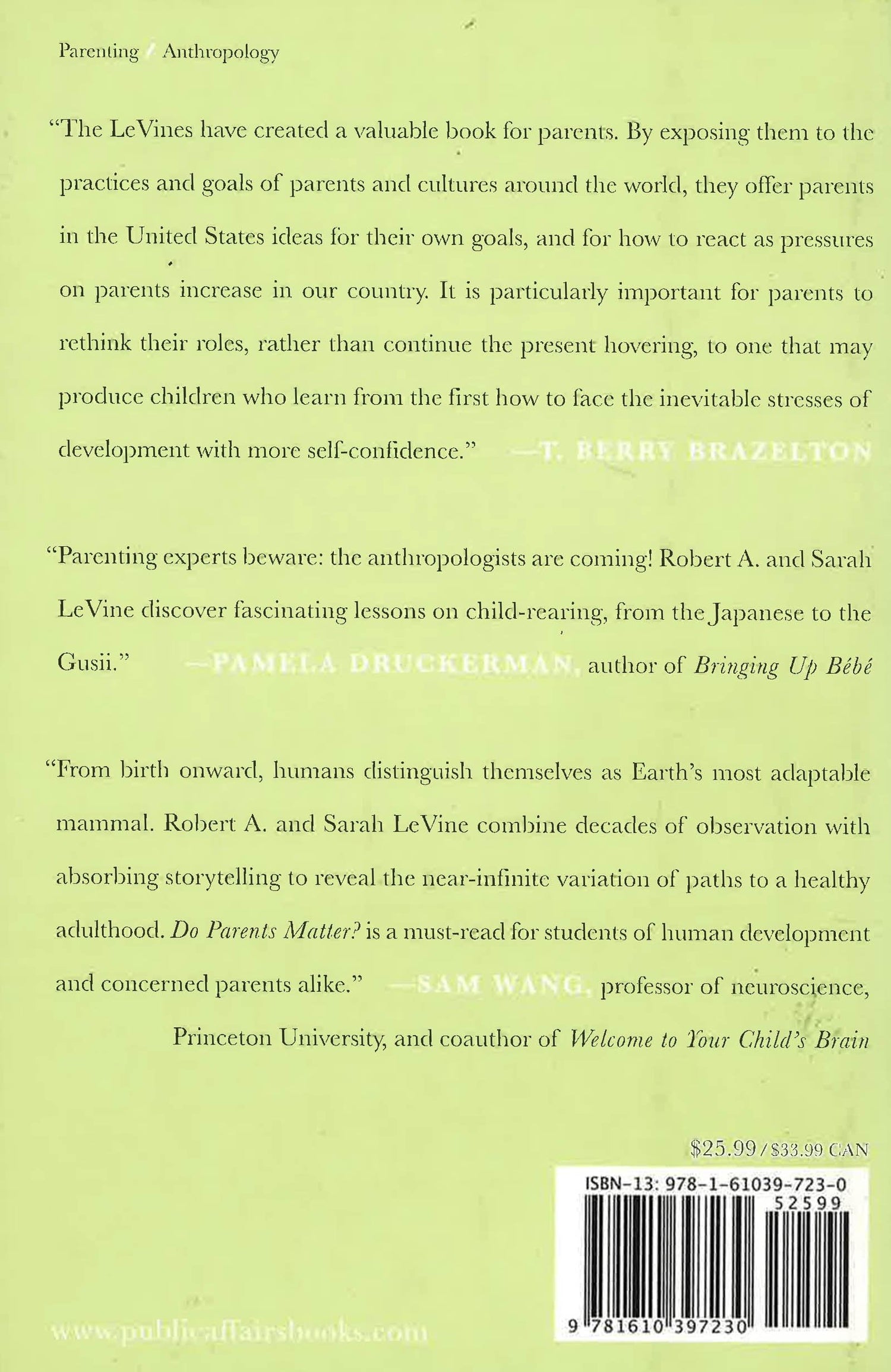 When it comes to parenting, more isn't always better,but it is always more tiringIn Japan, a boy sleeps in his parents' bed until age ten, but still shows independence in all other areas of his life. In rural India, toilet training begins one month after infants are born and is accomplished with little fanfare. In Paris, parents limit the amount of agency they give their toddlers. In America, parents grant them ever more choices, independence, and attention.Given our approach to parenting, is it any surprise that American parents are too frequently exhausted?Over the course of nearly fifty years, Robert and Sarah LeVine have conducted a ground-breaking, worldwide study of how families work. They have consistently found that children can be happy and healthy in a wide variety of conditions, not just the effort-intensive, cautious environment so many American parents drive themselves crazy trying to create. While there is always another news article or scientific fad proclaiming the importance of some factor or other, it's easy to miss the bigger picture: that children are smarter, more resilient, and more independent than we give them credit for. Do Parents Matter? is an eye-opening look at the world of human nurture, one with profound lessons for the way we think about our families.