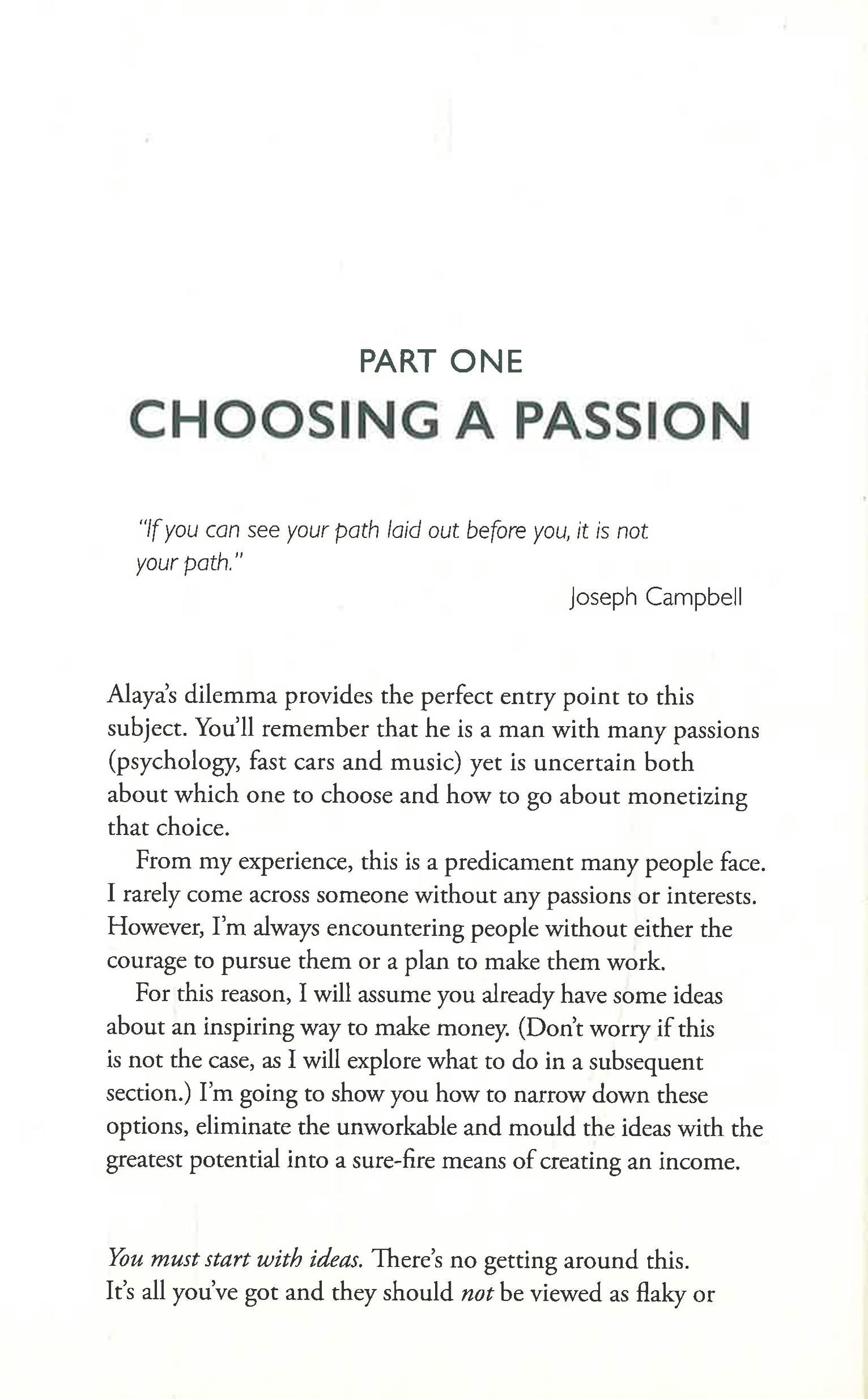 Part 1 explains how to discover a marketable passion with the help of the Dream Job Chart, which guides you in assessing your business ideas, skills and the causes you are passionate about. Once you have clarity on your passion, Part 2 describes the three possible paths to creating an income from it, offering inspiring examples of both famous and everyday people who have successfully followed each path. The Adventurer's Path is for those of a braver disposition and with few family commitments. The Strategist's Path is for those with patience, flexibility and a lower tolerance for risk. The Grinder's Path is for those who feel a need to continue with their present work while also pursuing their dream. Finally, Part 3 explores the four stages to becoming an expert in your chosen field, so that people will pay you for your skill or product. Along the way you will learn: Why bad luck can't stop you the right time to quit your job how to use freelancing or consultancy to help you reach your goal how to make progress with your passion even if you are working full-time what to do if you're over 50 and want to create an income from your passion and much, much more!
