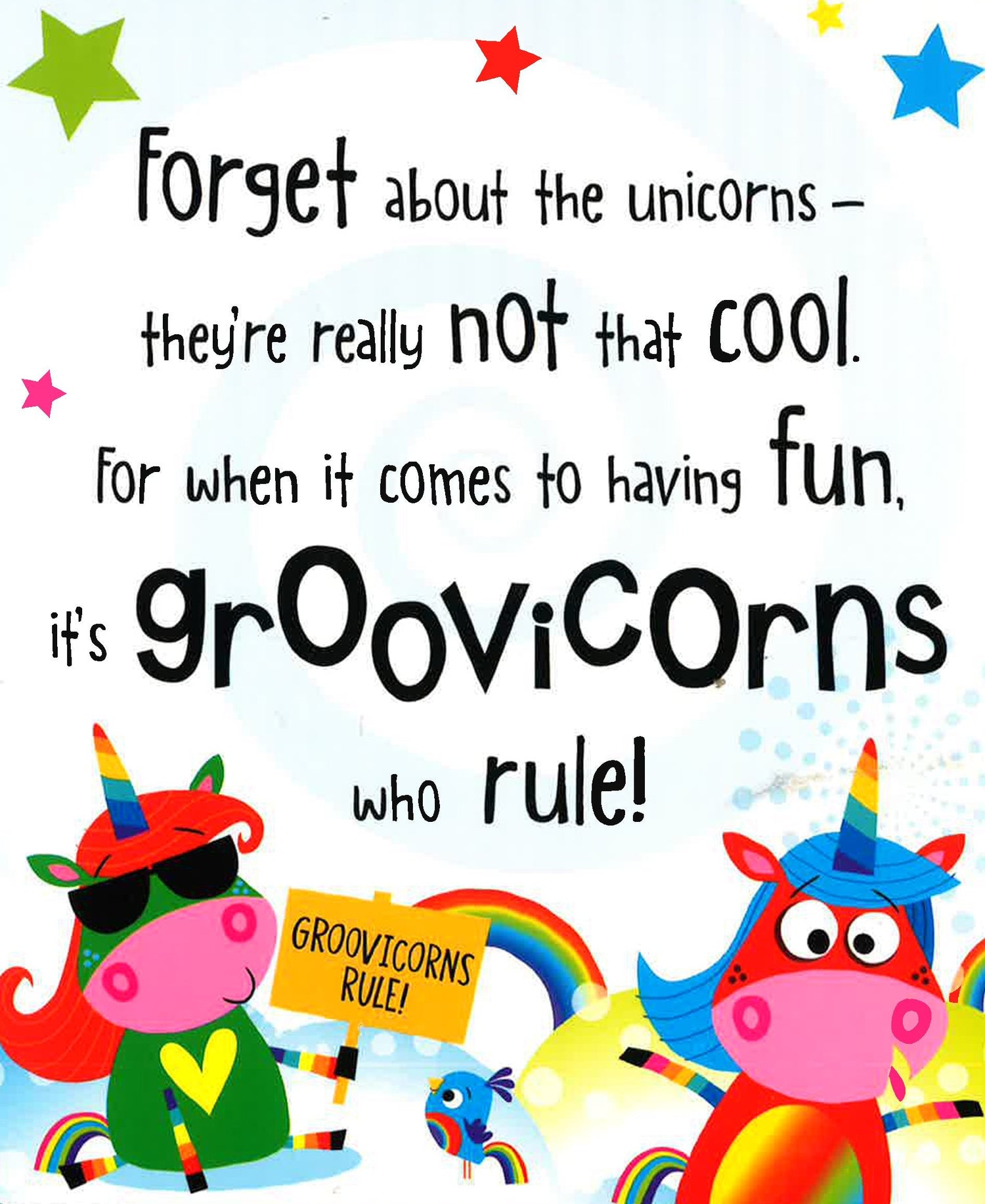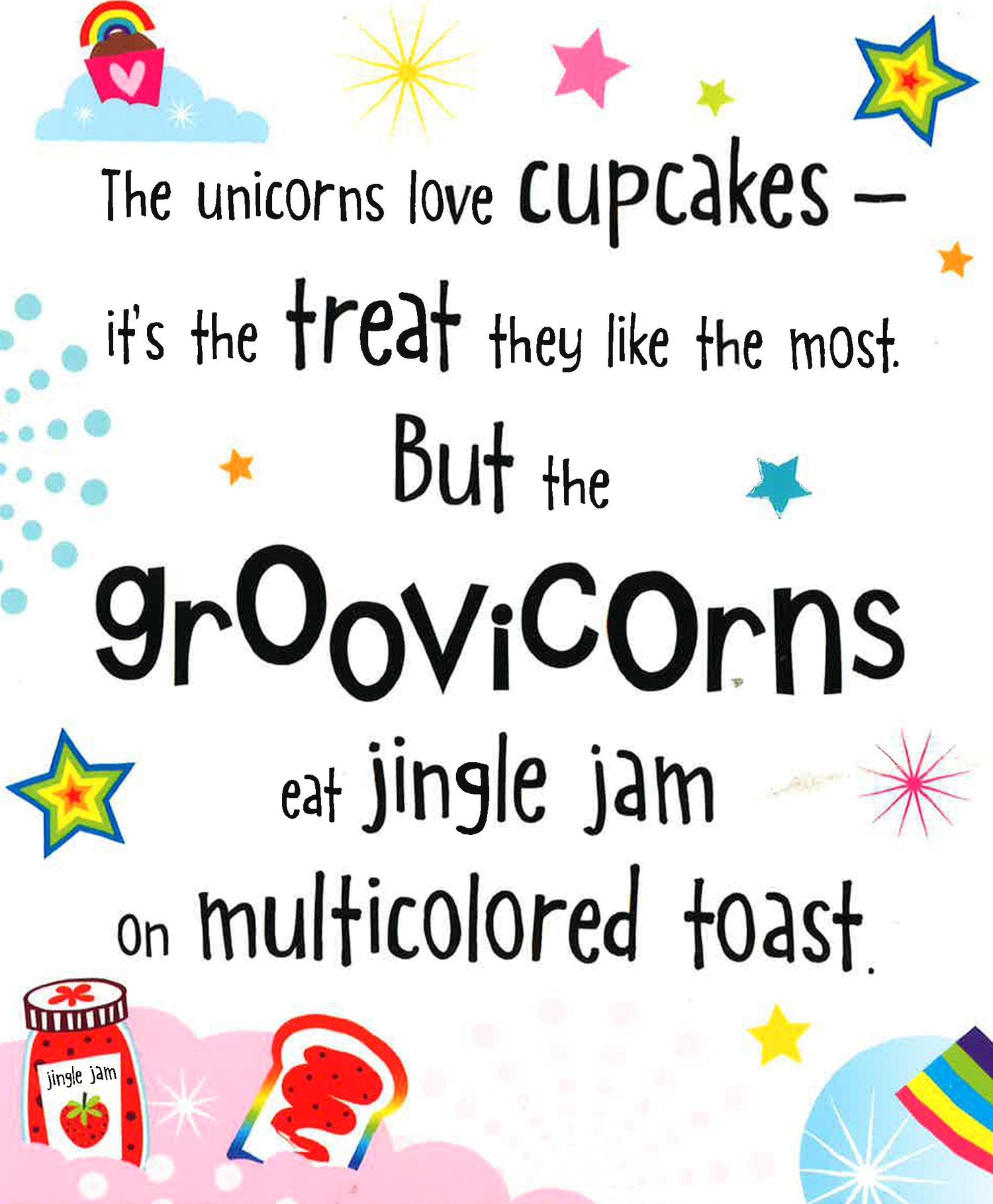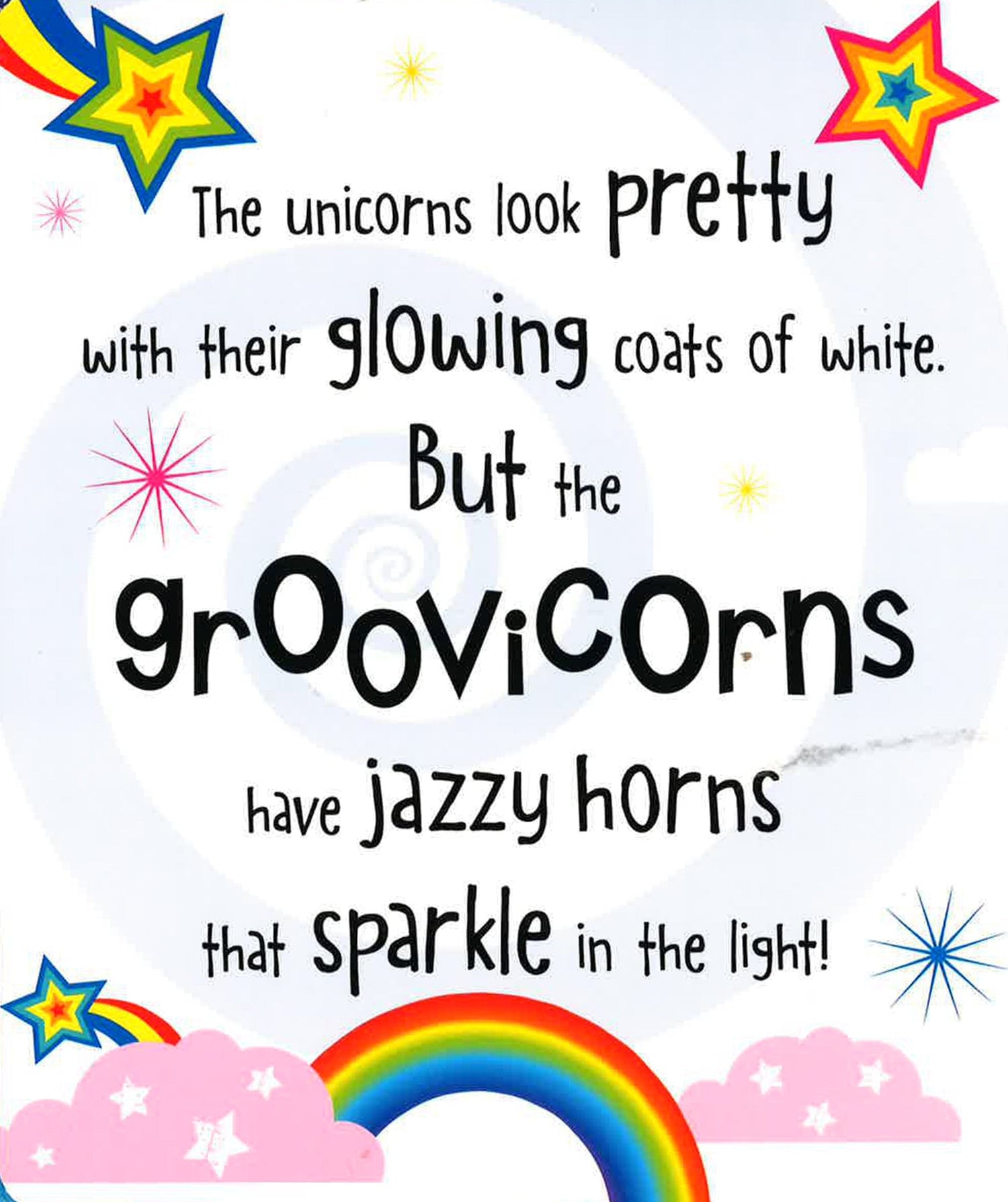 This unique touch-and-feel book, with a funny rhyme that explains why groovicorns are better than unicorns, is perfect for young children.
