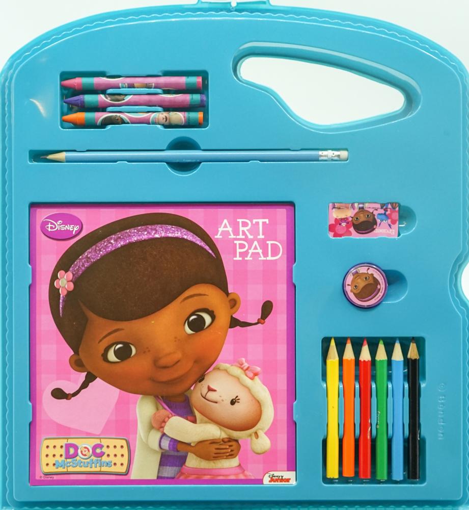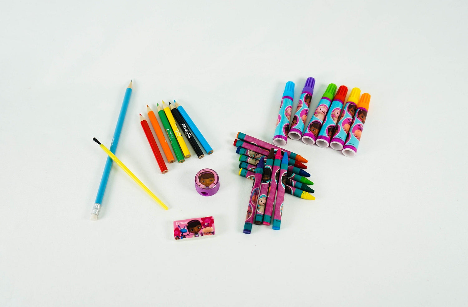 1 Art Pad, 10 crayons, 6 markers, sharpener, eraser, 6 coloured pencils and many more stationeries to make your child display their artistic skills!
