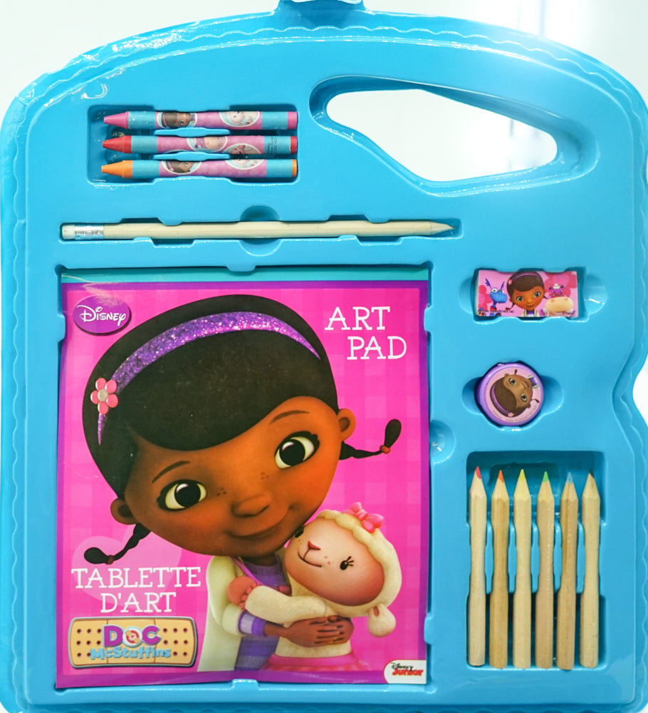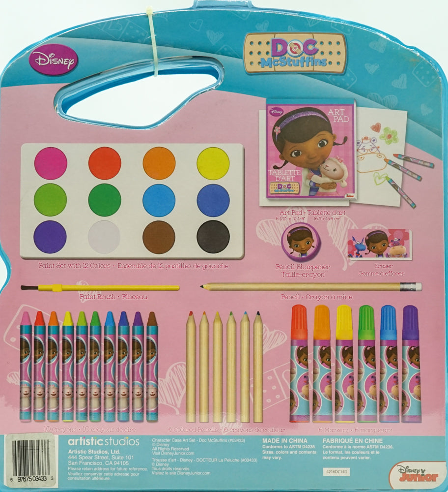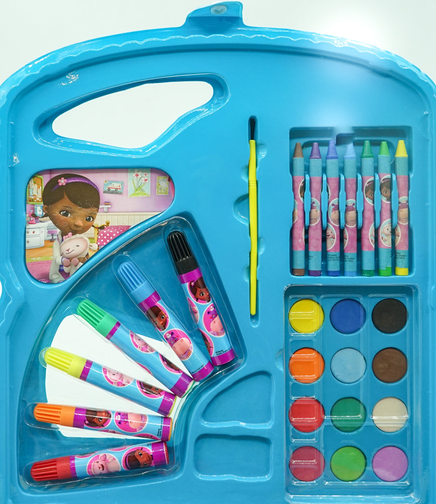 Includes 10 crayons, 6 markers, pencils, sharpener and eraser Also includes art pad and a paint set with 12 paints and a brush All items fit inside carrying case, Officially Licensed Product All the items your child needs to become an aspiring artist