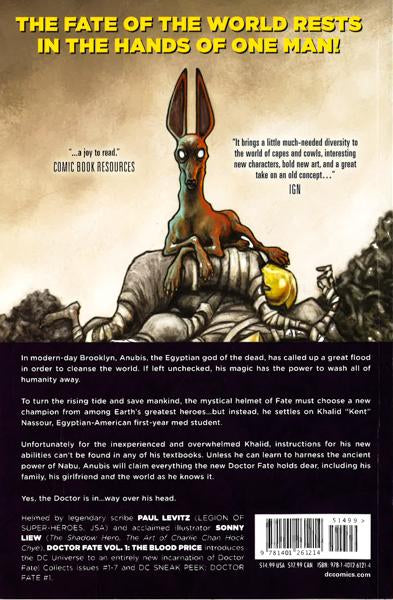 Legendary scribe PAUL LEVITZ (LEGION OF SUPER-HEROES, JSA) and acclaimed illustrator SONNY LIEW (MY FAITH IN FRANKIE) introduce the DC Universe to an entirely new incarnation of Doctor Fate! In modern-day Brooklyn, Anubis, the Egyptian god of the dead, has called up a great flood in order to cleanse the world. If left unchecked, his magic has the power to wash all of humanity away.To turn the rising tide and save mankind, Nabu the Wise, the mystical helmet of Fate, must choose a new champion from among Earth’s greatest heroes - instead, he settles on Khalid “Kent” Nassour, Egyptian-American first-year med student.Unfortunately for the inexperienced and overwhelmed Khalid, instructions for his new abilities can’t be found in any of his textbooks. Unless he can learn to harness the ancient power of Nabu, Anubis will claim everything the new Doctor Fate holds dear, including his family, his girlfriend and the world as he knows it.Yes, the Doctor is in . . . way over his head.Collects issues #1-7 and DC SNEAK PEEK: DOCTOR FATE #1.