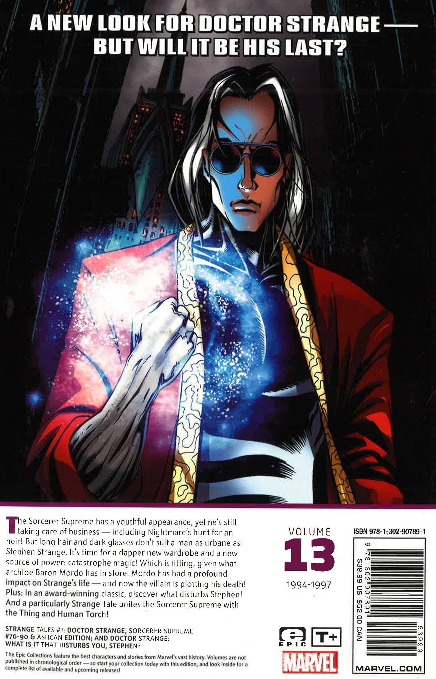 A new look for Strange - but will it be his last? The Sorcerer Supreme has a youthful appearance, yet he's still taking care of business - including Nightmare's hunt for an heir! But long hair and dark glasses don't suit a man as urbane as Stephen Strange. It's time for a dapper new wardrobe and a new source of power: catastrophe magic! Which is fi tting, given what arch-foe Baron Mordo has in store. Mordo has had a profound impact on Strange's life - and now the villain is plotting his death! Plus: In an award-winning classic, discover what disturbs Stephen! And a particularly Strange Tale unites the Sorcerer Supreme with the Thing and Human Torch! COLLECTING: VOL. 13: STRANGE TALES (1994) 1; DOCTOR STRANGE, SORCERER SUPREME 76-90, ASHCAN EDITION; DOCTOR STRANGE: WHAT IS IT THAT DISTURBS YOU, STEPHEN?