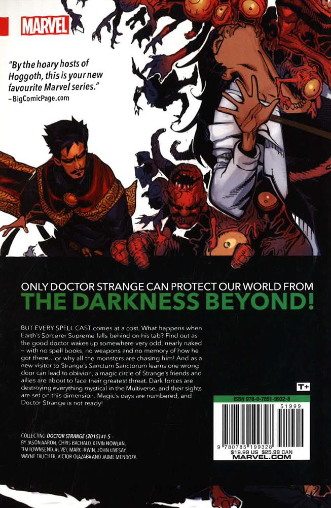 Only Doctor Strange can protect our world from the darkness beyond - now, witness the full toll that constant struggle takes on Earth's Sorcerer Supreme! Every spell cast comes at a cost, but what happens when Strange falls behind on his tab? Find out as the good doctor wakes up somewhere very odd, nearly naked - with no spell books, no weapons and no memory of how he got there...or why all the monsters are chasing him! And as a new visitor to Strange's Sanctum Sanctorum learns one wrong door can lead to oblivion, a magic circle of Strange's friends and allies are about to face their greatest threat. Dark forces are destroying everything mystical in the multiverse, and their sights are set on this dimension. Magic's days are numbered, and Doctor Strange is not ready! COLLECTING: DOCTOR STRANGE 1-5