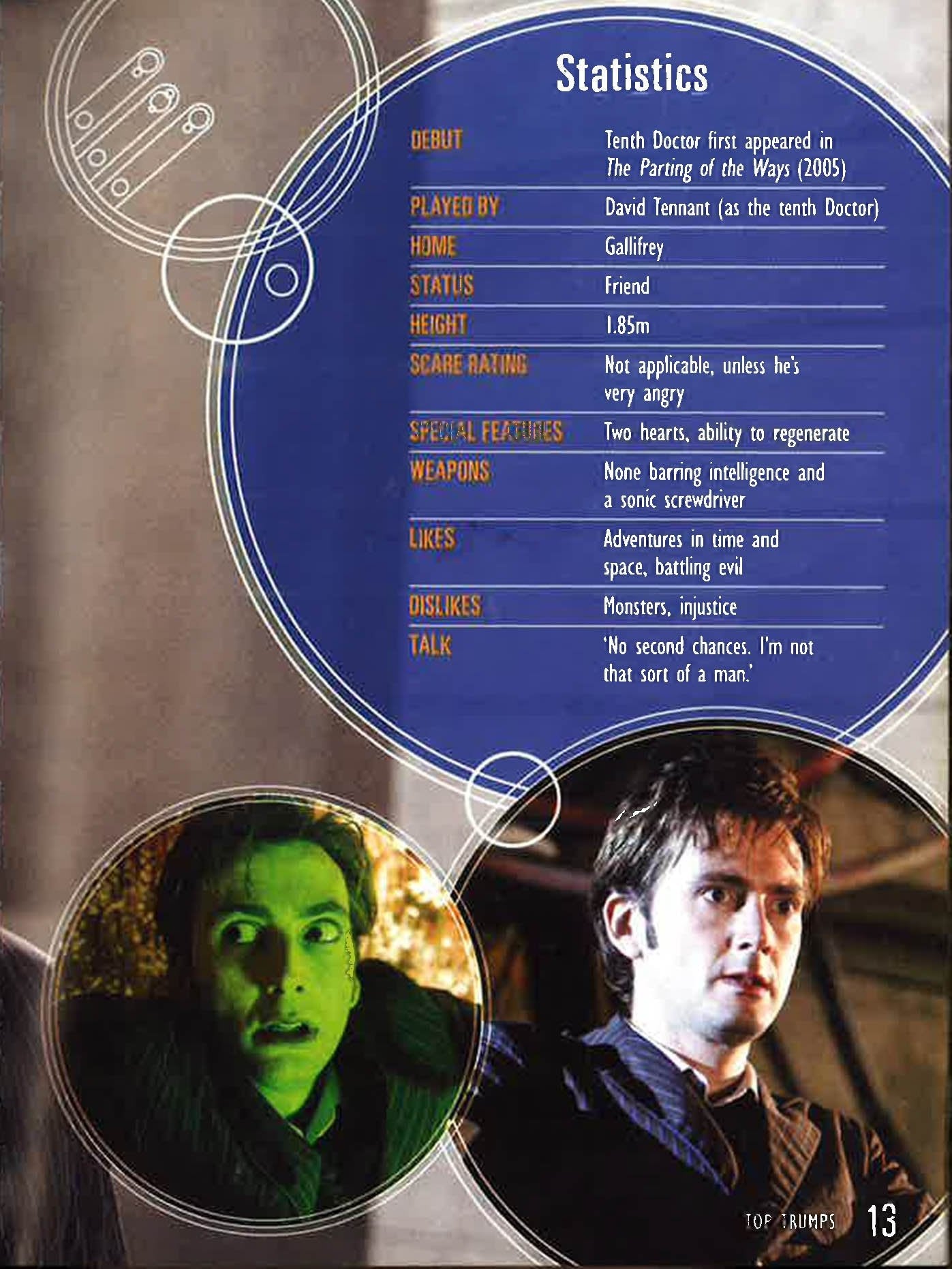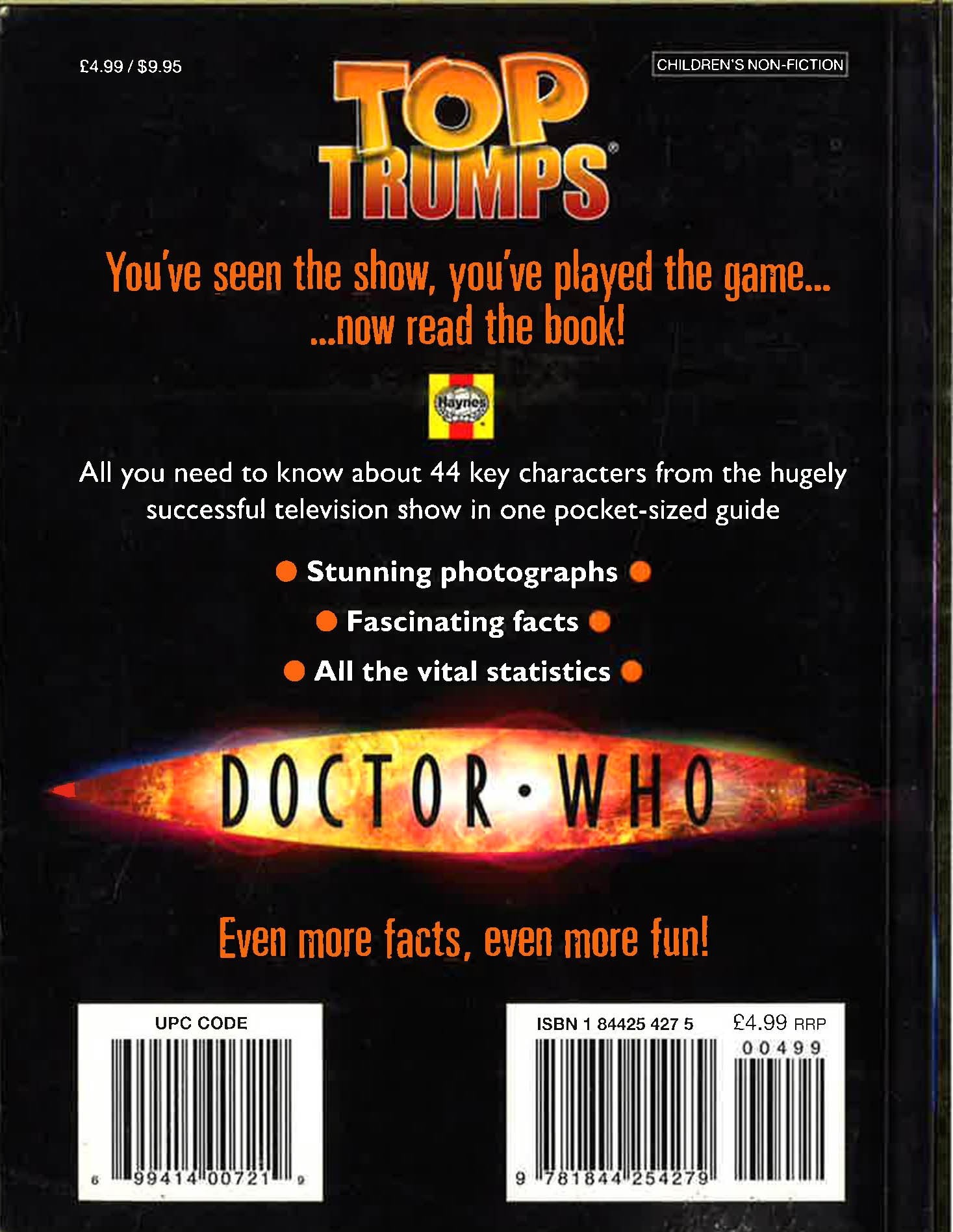 "Doctor Who" and "Top Trumps" are two names that need no introduction, and now Haynes have brought them together to create an exciting addition to the "Top Trumps" books series. This pocket-sized guide features 44 characters from the hugely successful television show, from "The Doctor, Rose and the Tardis" to "Slitheen", "Cybermen" and "Daleks". Packed with stunning pictures, fascinating facts and all the vital statistics, it will keep kids and grown-ups quiet for hours.