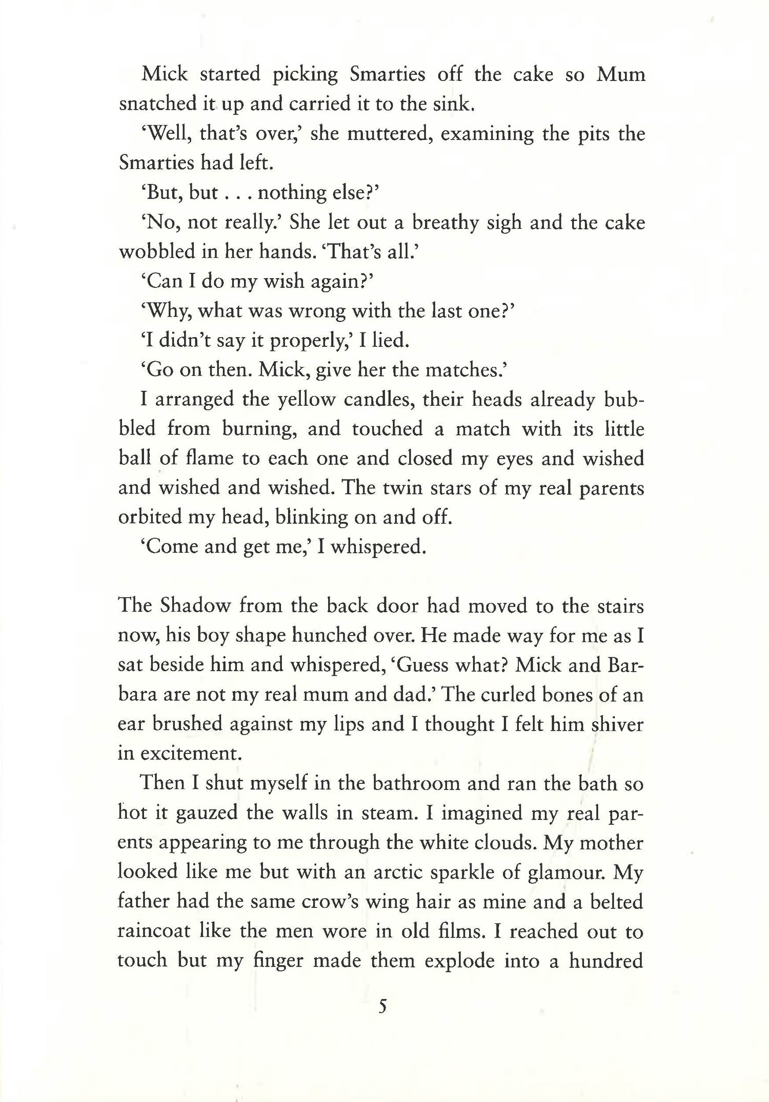 But there are things I won't say. I won't tell them I'm going to hunt for my real parents. I don't say a word about Shadow, who sits on the stairs, or the Wasp Lady I saw on the way to bed.