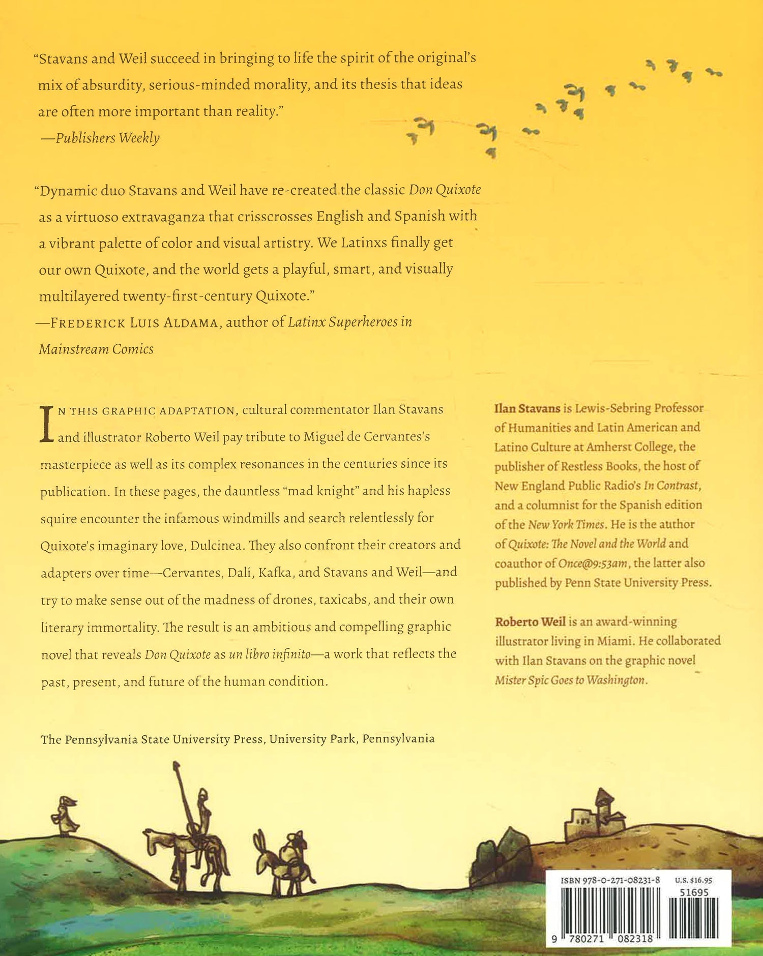 In these pages, Stavans and Weil pay tribute to Cervantes’s novel as well as its complex resonances in the centuries since its publication. The dauntless “mad knight” Don Quixote and his hapless squire, Sancho Panza, encounter the infamous windmills, contend with disbelieving peasants and noblemen, and seek relentlessly for Quixote’s imaginary love, Dulcinea. They also confront their own creators and adapters―Cervantes, Salvador Dalí, Franz Kafka, and Stavans and Weil themselves―and try to make sense out of the madness of drones, taxicabs, and their own literary immortality. The result is an ambitious and compelling graphic novel that reveals Don Quixote as un libro infinito―a work that reflects the past, present, and future of the human condition.
