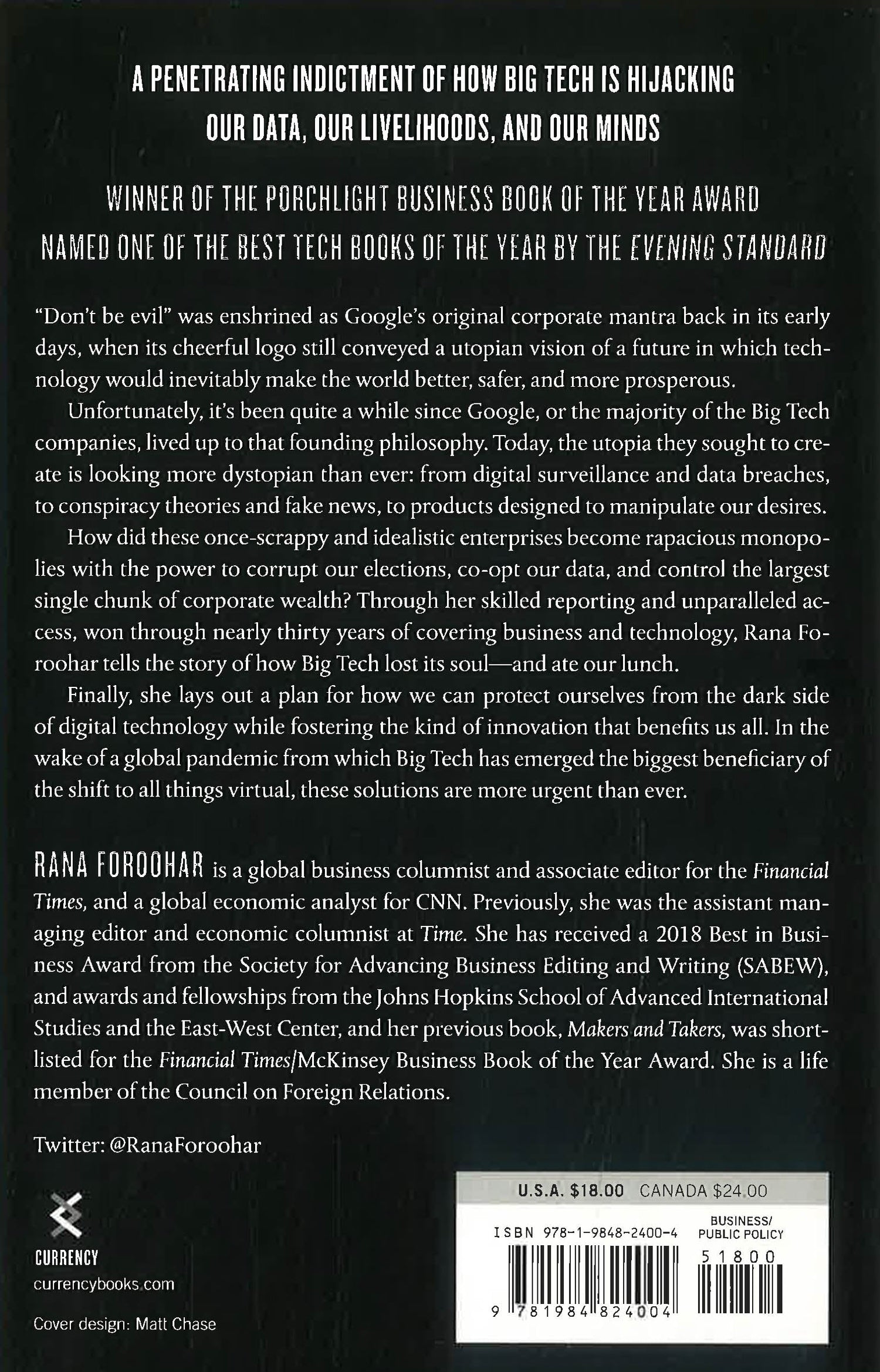How did we get here? How did these once-scrappy and idealistic enterprises become rapacious monopolies with the power to corrupt our elections, co-opt all our data, and control the largest single chunk of corporate wealth--while evading all semblance of regulation and taxes? In Don't Be Evil, Financial Times global business columnist Rana Foroohar tells the story of how Big Tech lost its soul--and ate our lunch.